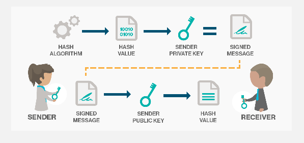 With Digital Signature, three processes are required; hashing, signing and verifying. Where all data inputted into a block is hashed, after which it is signed by the sender using public-key cryptography, where the private key is used to sign the message and the receiver verifies the authenticity with the help of a corresponding public key (the sender's public key) 5. With Digital Signature, both sender and receiver can trust that the message wasn't tampered with during the process of sending and a change in the message after sending will change the signature completely.