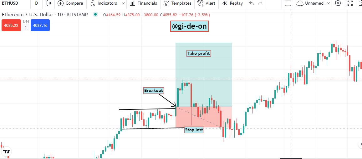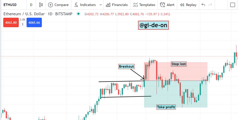 For the purpose of this lesson I will be setting up a trading procedure with the Entry Point, Take Profit, Stop Loss, Breakout all being displayed in the chart as shown below. This is simply done with the asset ETH/USD.