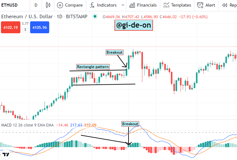 As shown in the screenshot below to justify my claim, I will be using the MACD indicator alongside the rectangular pattern. From the screenshot, you will see from the indicator more clearly that when the price of the asset downtrend is displayed properly and more visible with the RED color and shorter bars to show that have been or the market is currently experiencing a downward trend. Hence since there was a rectangular structure formed, from the indicator you iwill notice that the colors of the bars are not the same, there are others that are more redish than others.