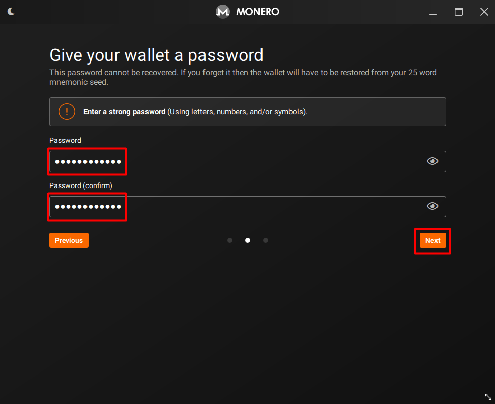 12. You will be asked to create a password which will be the password to access your wallet, create a strong password. After that, click the Next button.