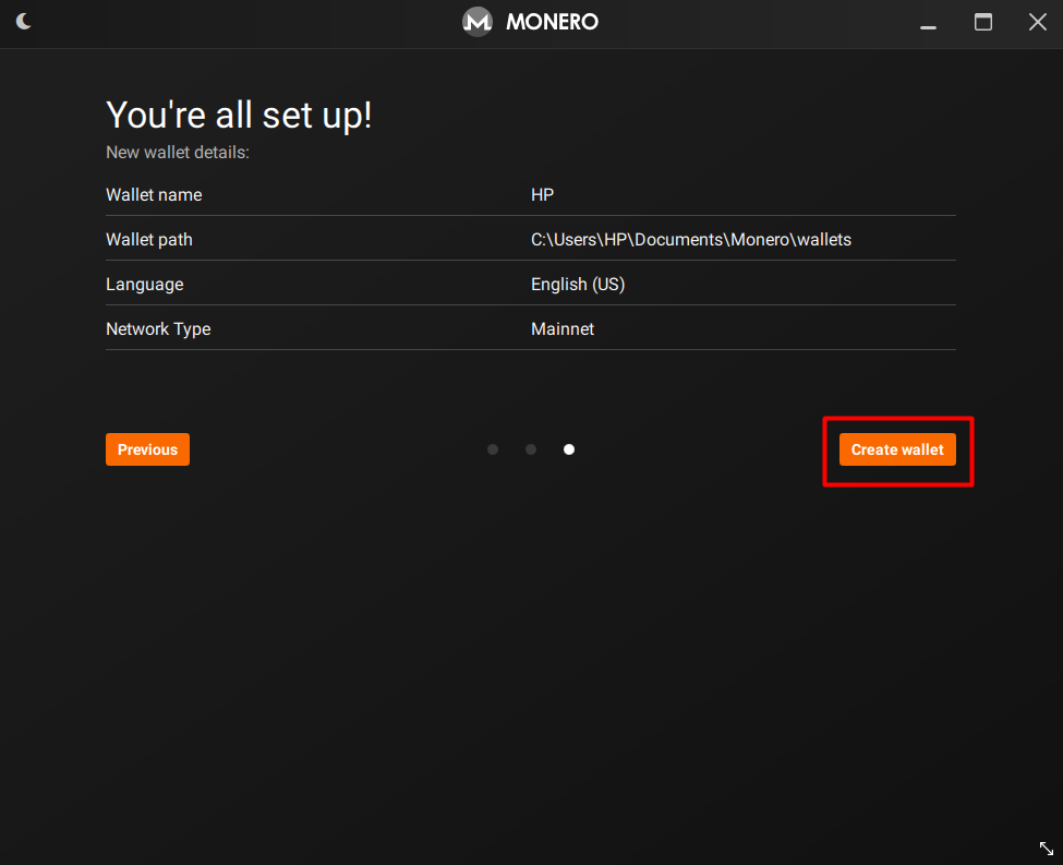 13. Click on the Create wallet button to continue the process of creating your privacy coin wallet.