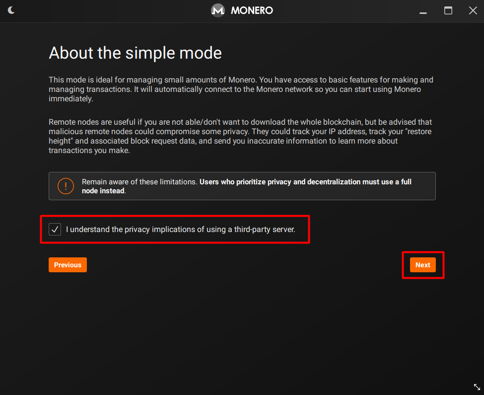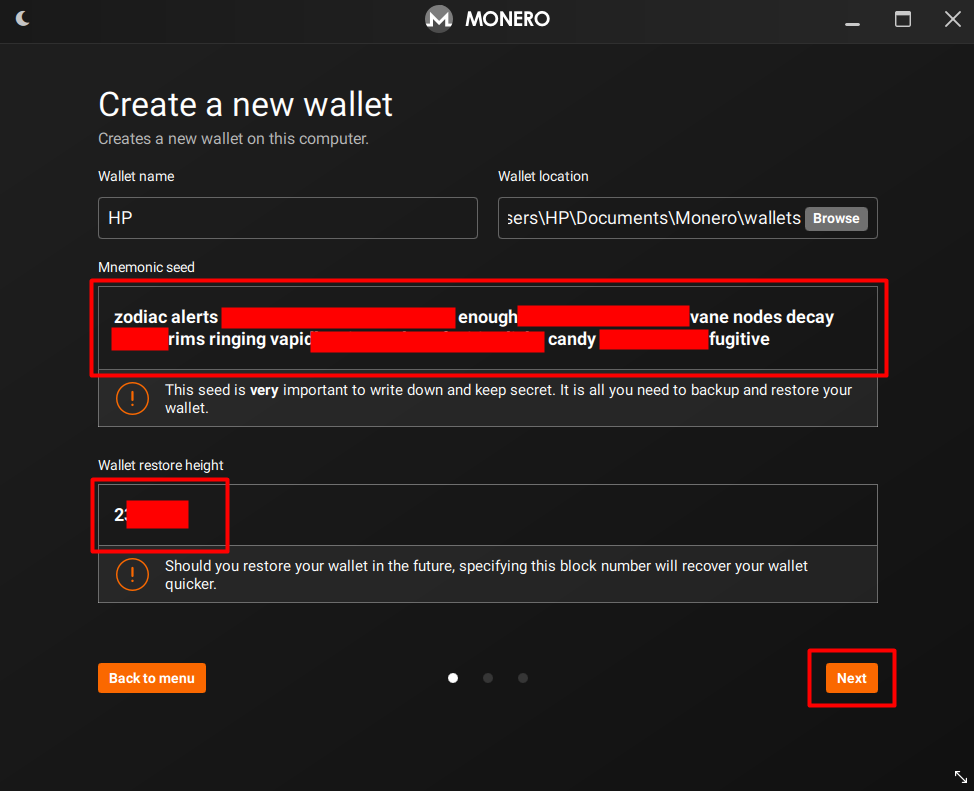 11. Kalian akan diberikan sebuah kalimat yang akan menjadi Mnemonic sedd wallet kalian serta sebuah kode angka yang merupakan wallet restore height kalian, jangan lupa untuk menyimpan kedua kode tersebut di tempat yang aman. Setelah selesai menyimpan pada tempat yang aman, pilihlah tombol Next.