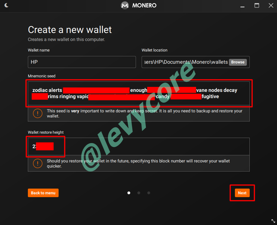 11. You will be given a sentence that will become your Mnemonic seed wallet and a numeric code which is your wallet restore height, don't forget to save both codes in a safe place. When finished saving in a safe place, select the Next button.