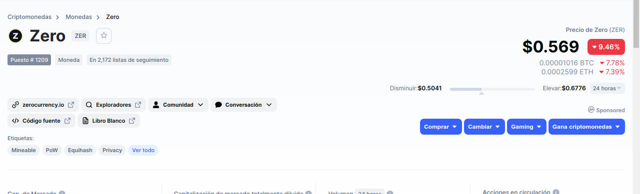 La moneda denominada ZERO ( ZER ) acctualmente cuesta 0.569 dolares por moneda y en las ultimas 24 horas se an comercializado un total de $273,820 USD. y viene a la baja en 9.81% en las últimas 24 horas.