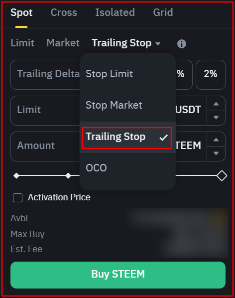 | Step 1 - Click on the limit | Step 2 - Select Trailing Stop | Step 3 - Set percentage |