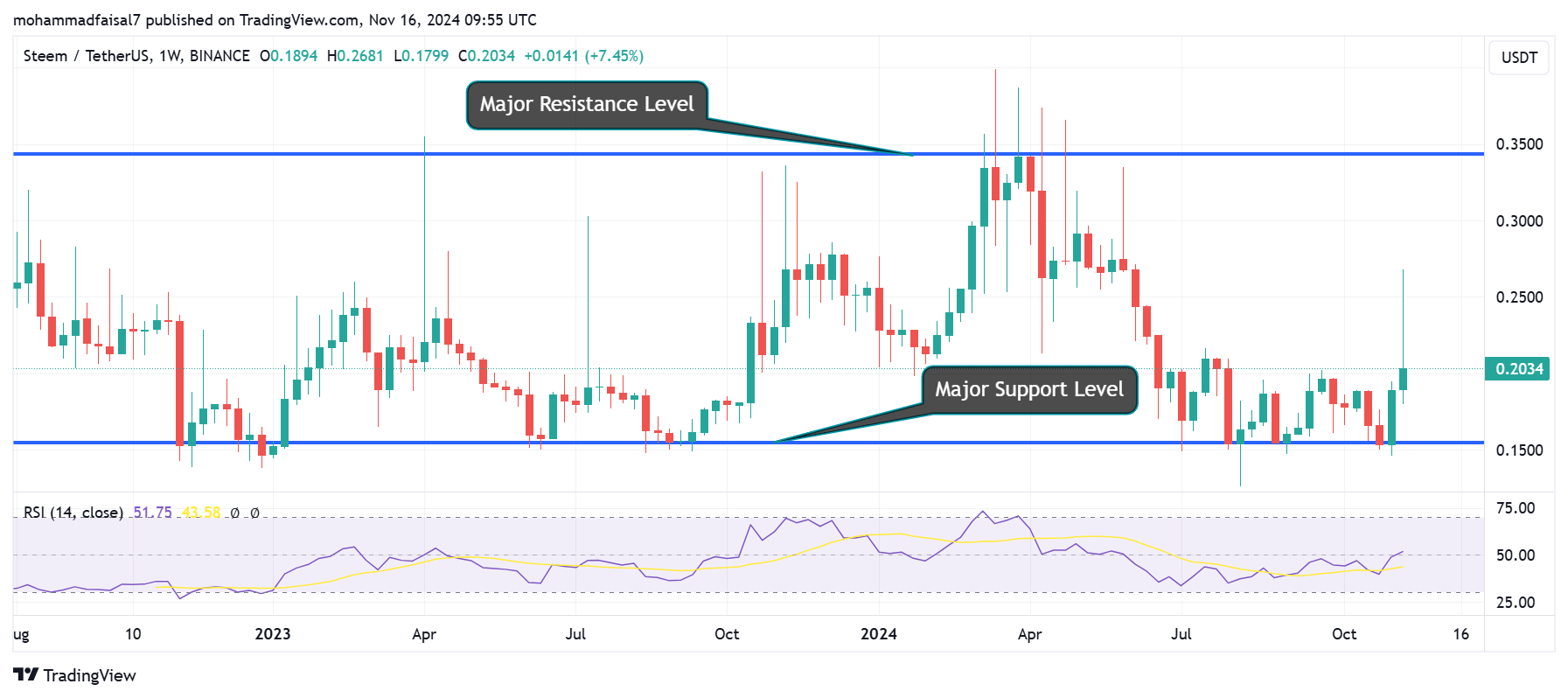 This is the broader view of the STEEM/USDT trading pair in the weekly timeframe. We can observe strong resistance and support levels in this broader view. The price is always moving in the key resistance and support levels. The key resitance level in this timeframe is about $0.3450 and similarly if we look for the support level that is around $0.1450.