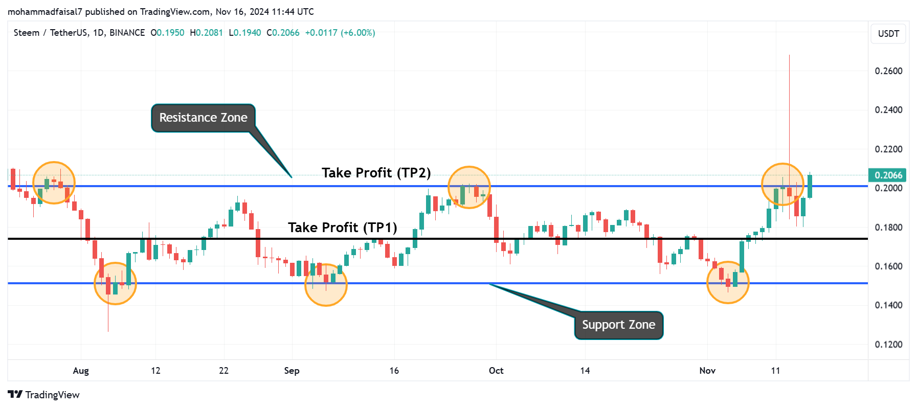 - TP2: I have set the next take profit level at the price level of $0.2517. I have considered it as the next recent resistance after the first resistance zone which is now acting as a support level with respect to this resistance. So if the trader takes an entry at the base support level and exit trades at this point then he can make a handsome profit.