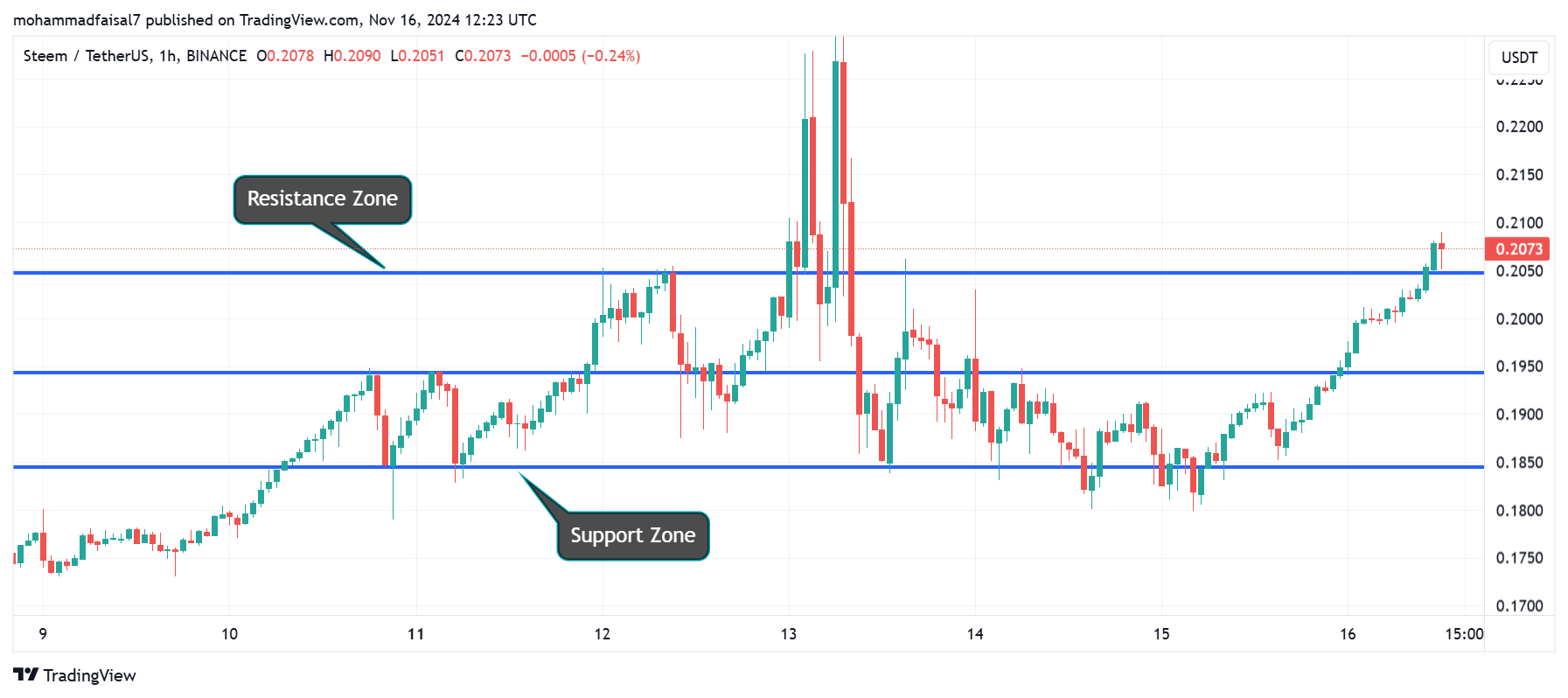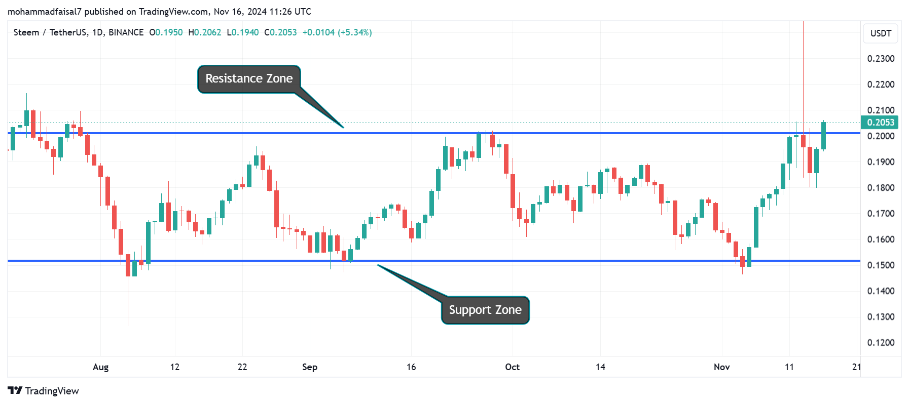 In the daily time frame this is the STEEM/USDT chart where the support and the resistance levels are highlighted with the help of the blue line. We can see the price is moving in the zig zag movement. The price touching the support level and the resistance level and it is moving in between the support and the resistance level. In this daily timeframe the support level is at around the $0.1522 and the resistance level is at the $0.20.