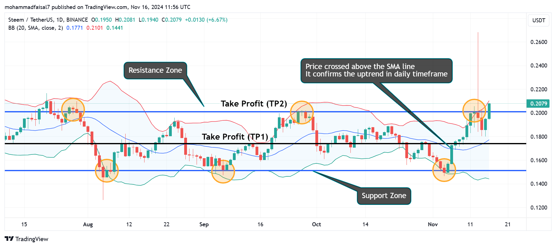 - Daily Timeframe: Look for bullish patterns like breakouts from key resistance levels or moving average crossovers.