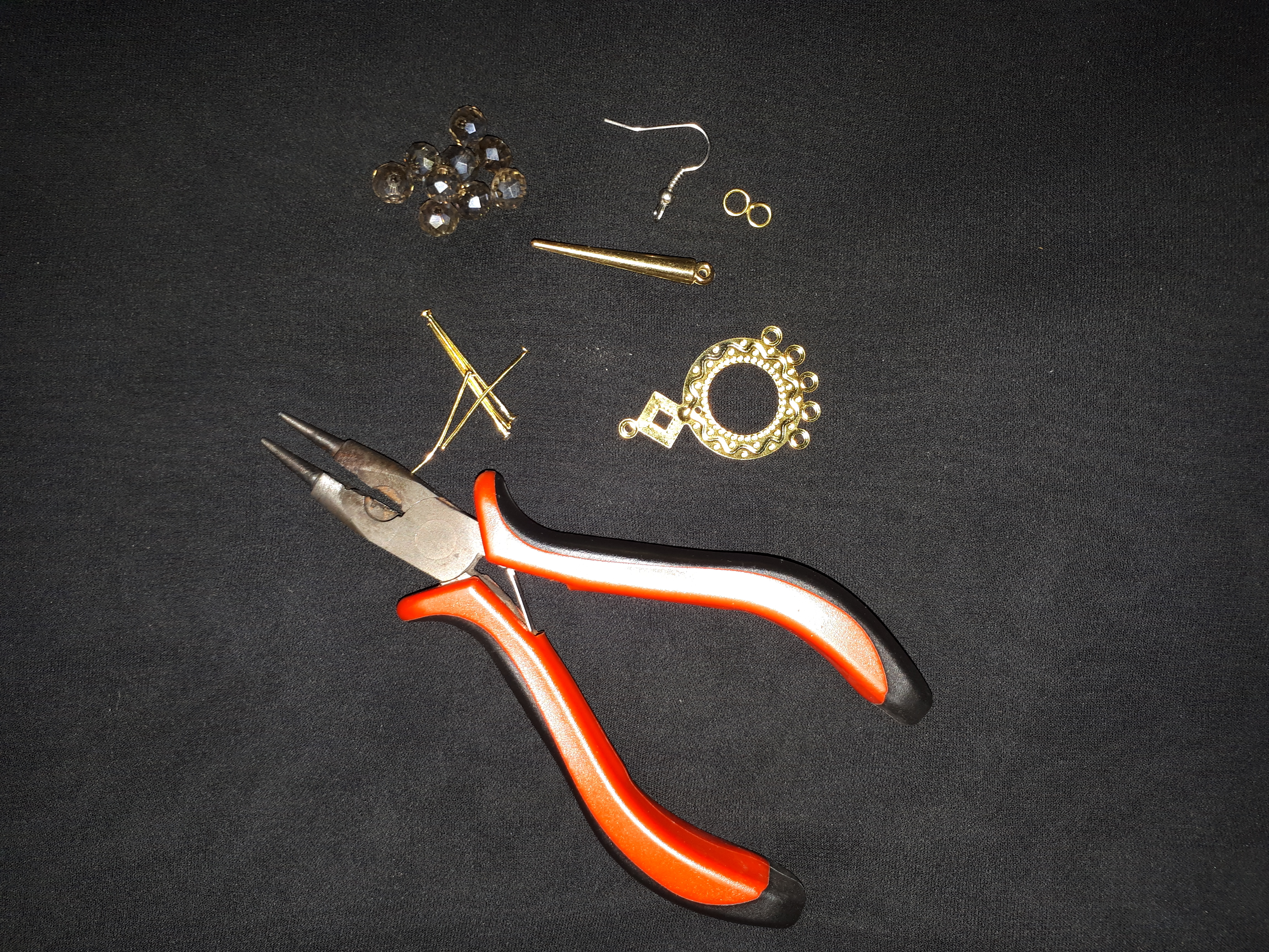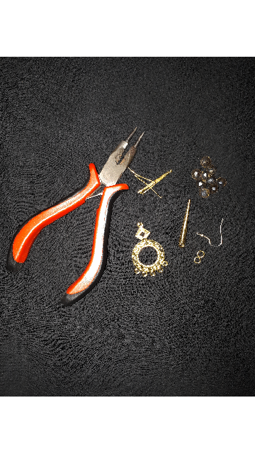 Provide some material as base material such as: long bead cone, earrings hook, ring 0.6mm, round nail, 8mm crystal, round charm, tool work using pliers.