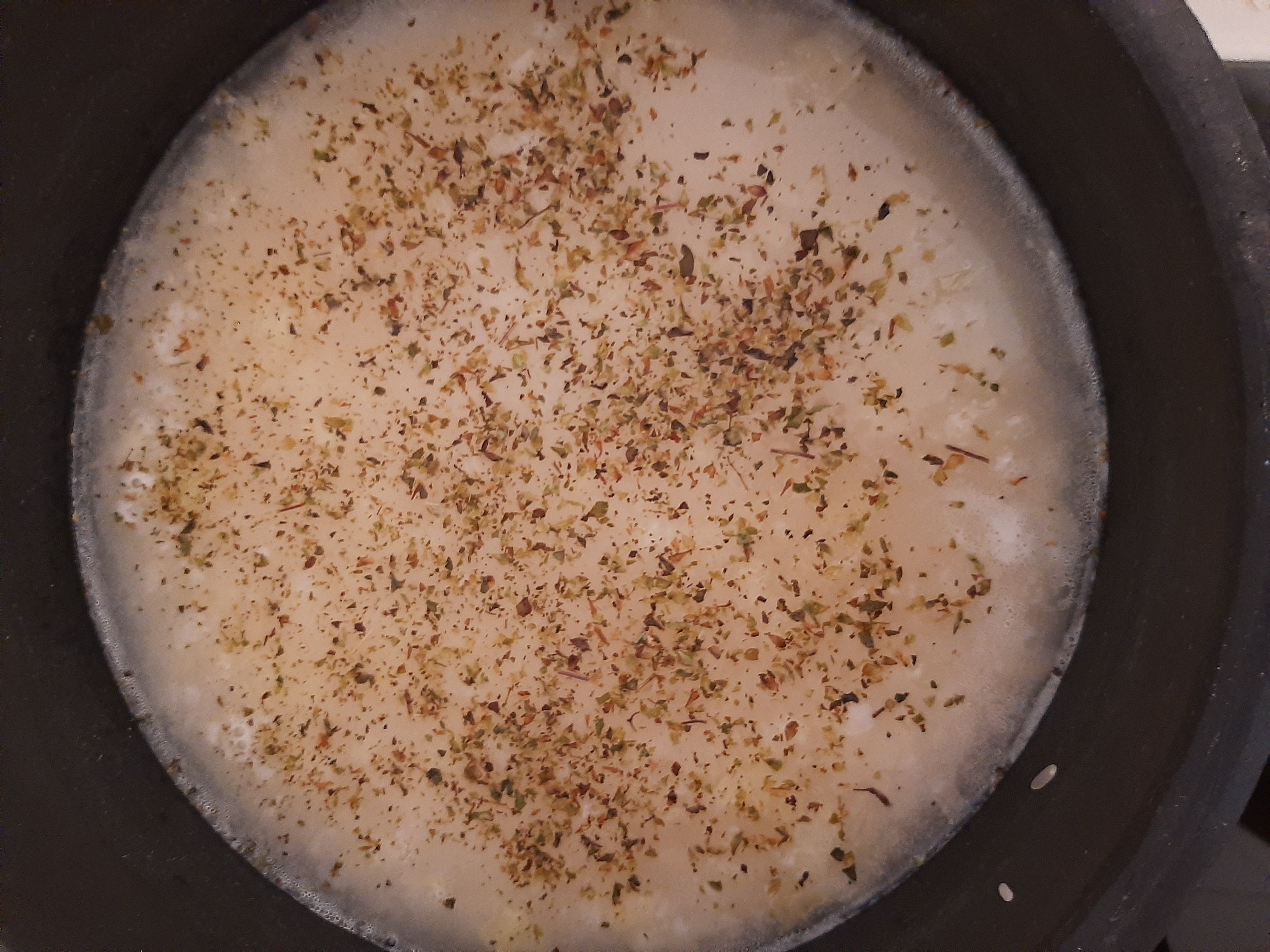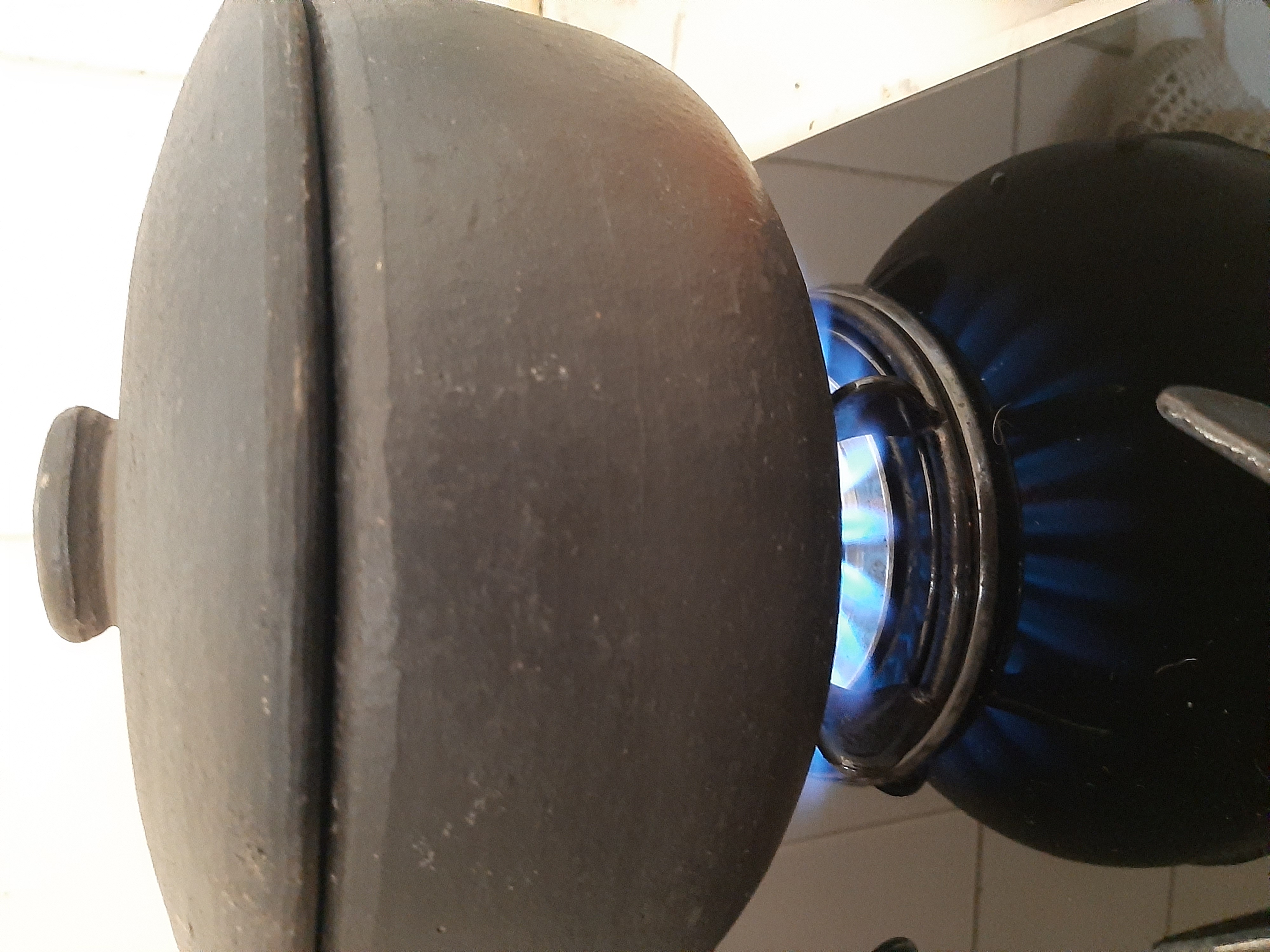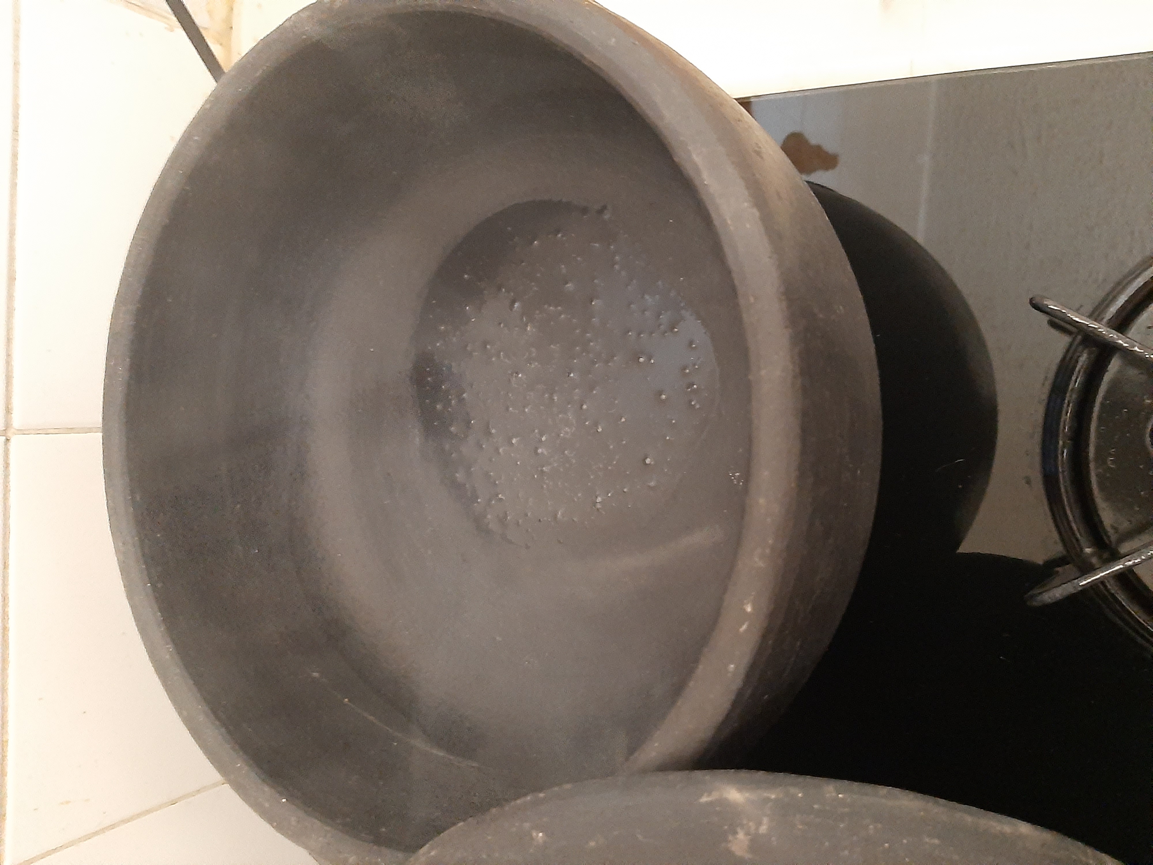●First step is to add a little extra virgin olive oil so that the reaction can happen and thus strengthening the pan to receive a lot of heat for a long time. Wait about 15 minutes on high heat and with the lid on the clay pot.