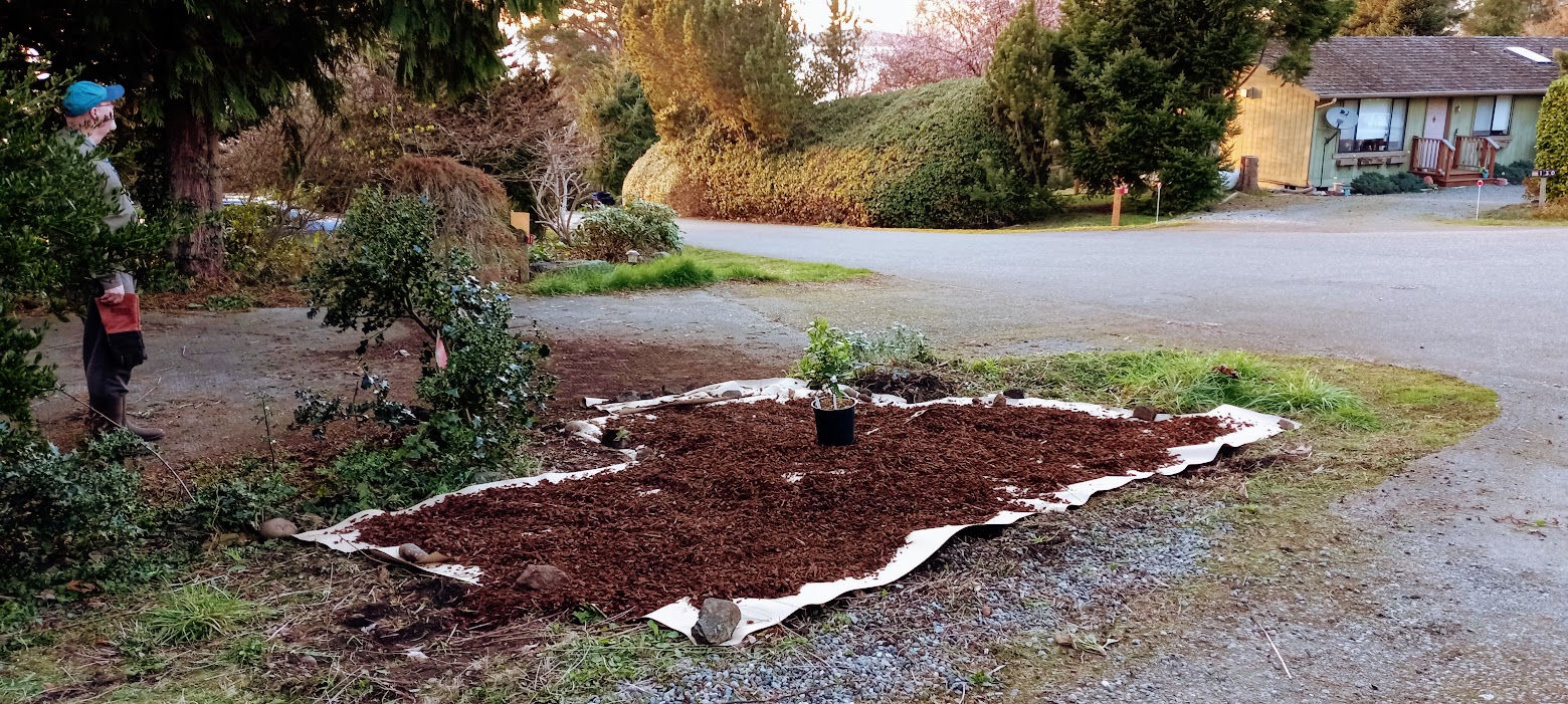 Once removed, we laid down brown paper to block new growth from below and then added a layer of bark mulch on top. Here, we're almost done with the process: