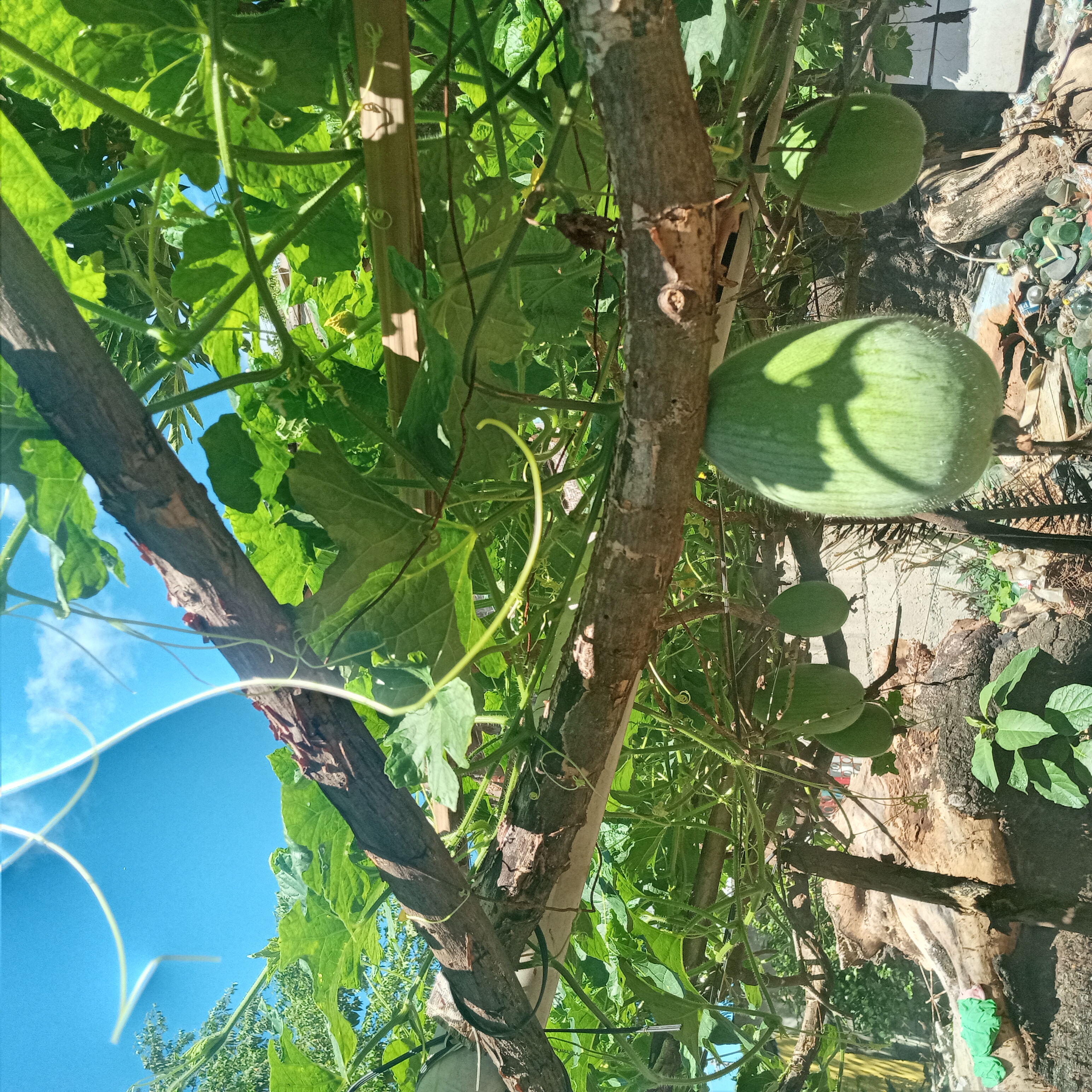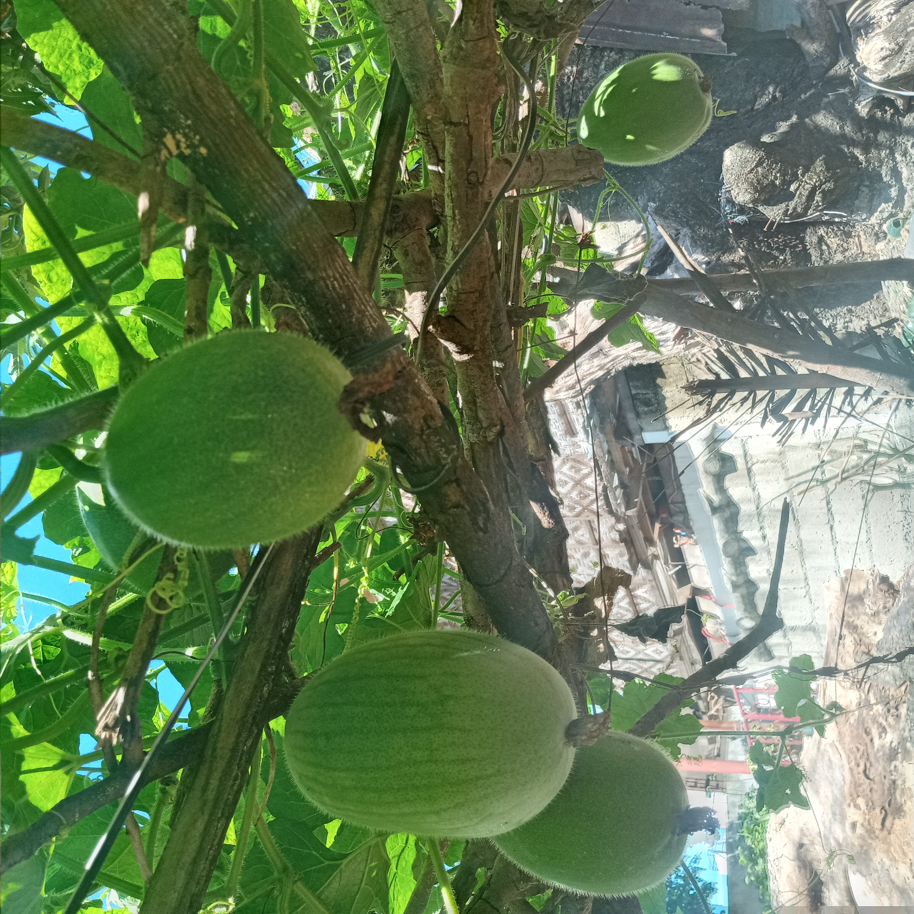 Which for now, it is perfectly having its fruit that looks so beautiful. Because of natural colored which it is so attractive. The vines also perfect to crawl on the old twigs of the tree that I made as trellis. And fruits hiding under the leaves which is a sign that it was almost on a harvest stage...