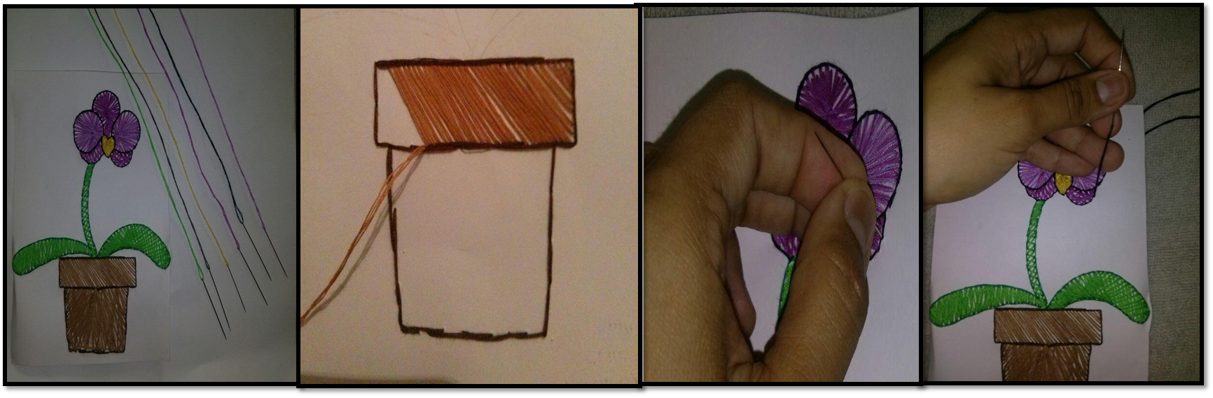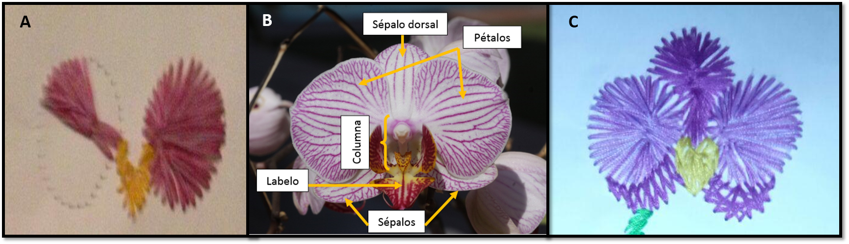 The next step was to sew the flower, I started with the petals (inner part of the perianth) in this part I placed three threads of different violet tonalities. To make the sepals (external structures of the perianth) use the intense purple color and for the labellum (modified petal).