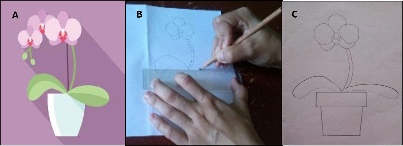 An image of the plant was chosen by internet which belongs to the genus Phalaenopsis, then I proceeded to draw the image (with some modifications) on a sheet of paper. Later the drawing is stamped on the cardboard sheet.