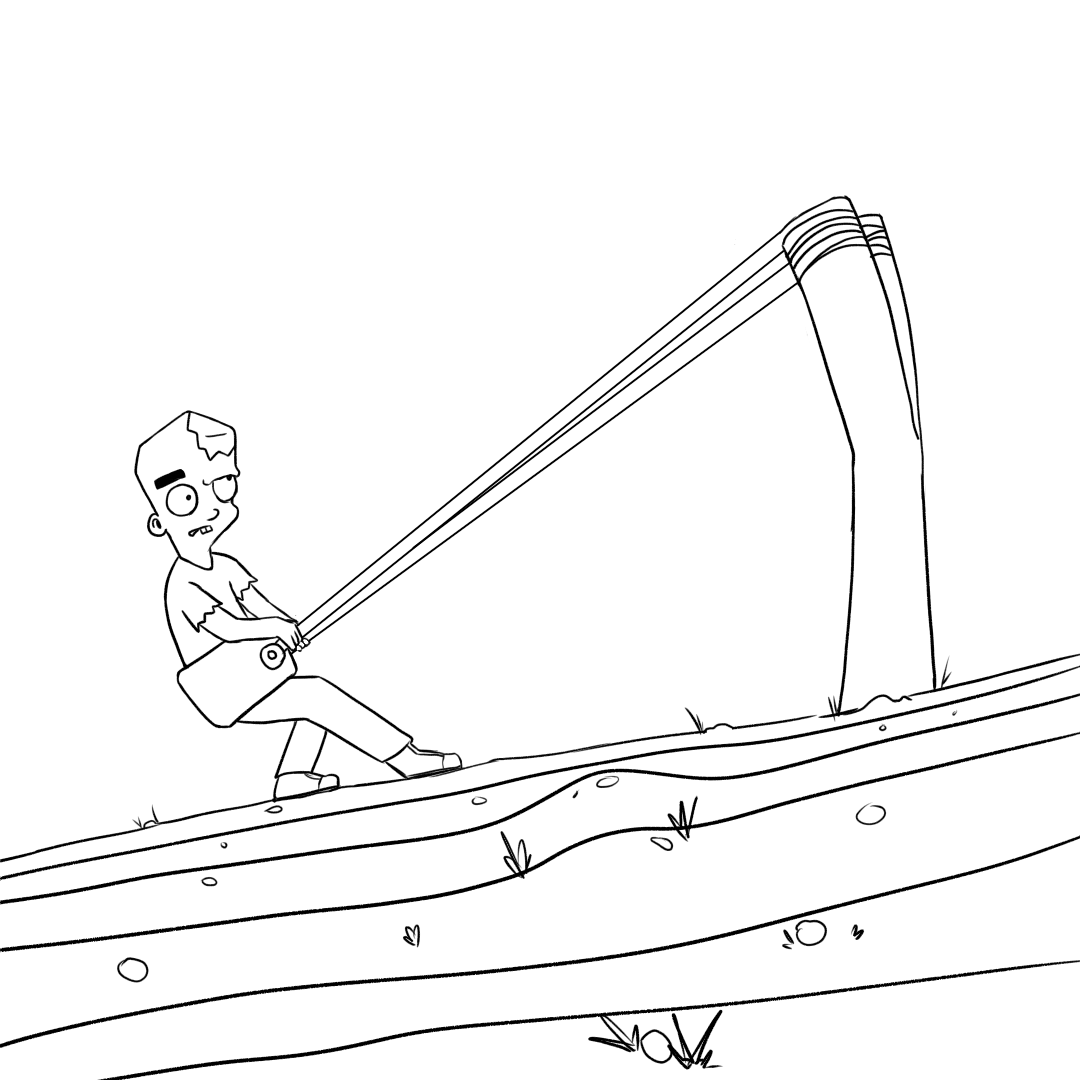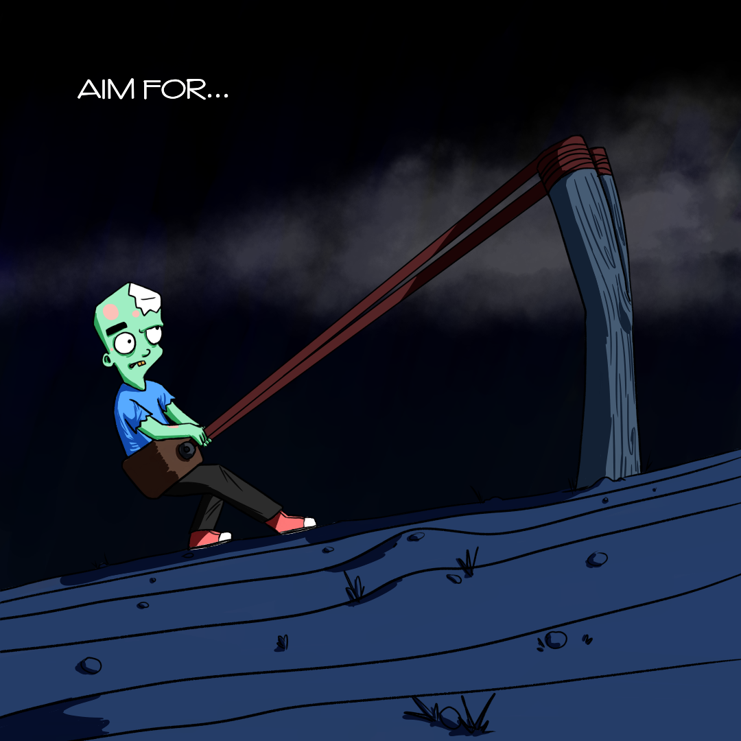 Thank you for your version of Aim to the moon, your character reminds me Simpsons although they are not completely similar but there is something in common. I like the idea to use slingshot in order to send him to the moon then we do not need expensive space vessels. But still in order to rich the aim you need to know a bit physics. Like how you made the colors to your comic, digital program gives you an opportunity to bring the painting close to animation.