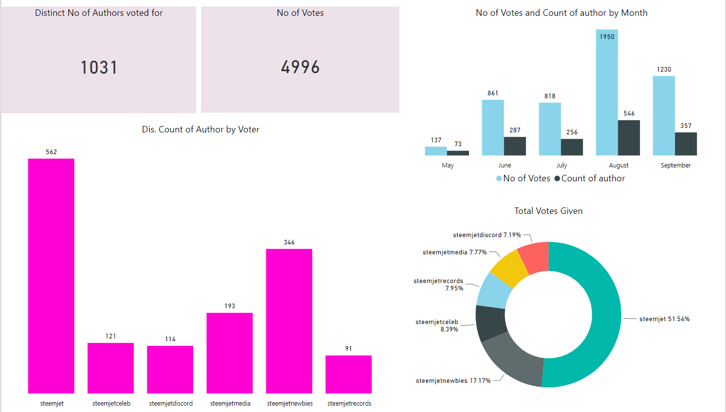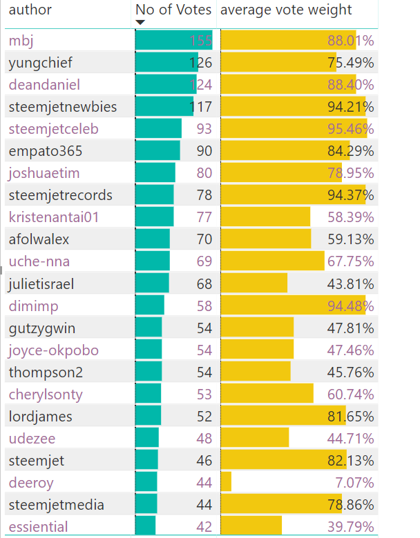 The @steemjet account has given out over 51% of all the votes from this group and have reached 562 unique accounts. We can also see a sharp rise in both the number of accounts and the no of votes given in August. Its worth pointing out here, that most of the delegation was done in August.