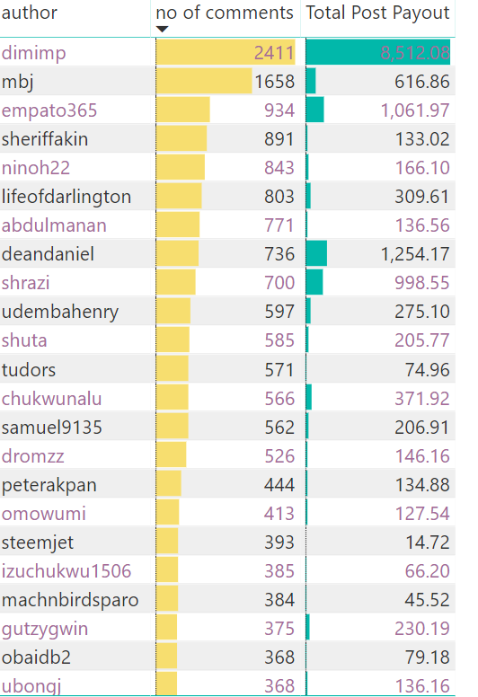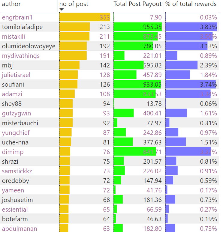 We can see from the time line charts, the number of posts peaked in August, the post payout peaked in June and the number of comments on posts peaked in May. Shout out to the community leaders here. It would be nice to see engagement on posts in this tag pick back up again, however people have to be willing to engage with each other.