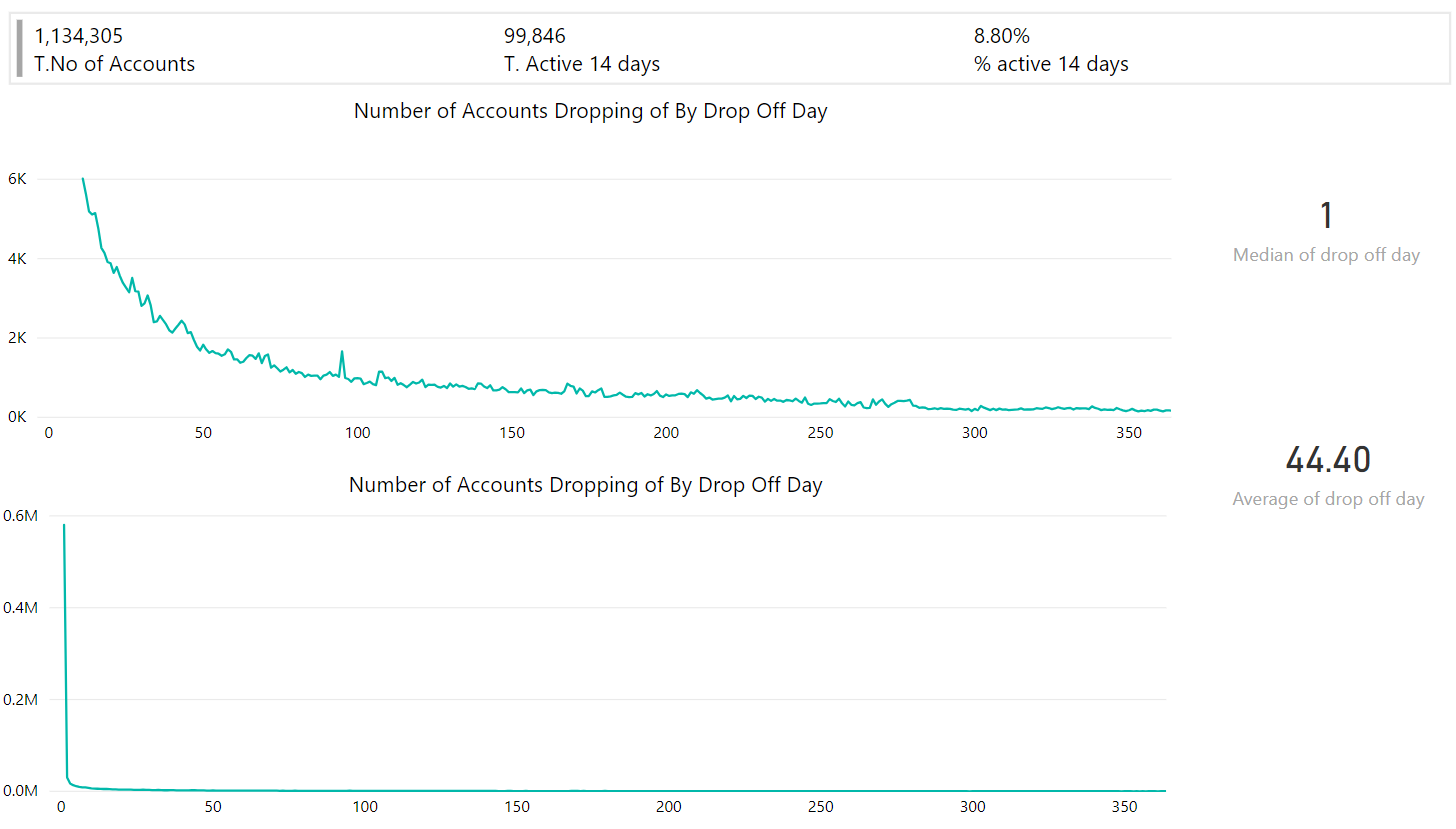 STEEM as a posting a voting platform in general has a low retention rate. Out of 1.134M accounts on steemit only 8.8% have been active in posting or voting in the last 14 days. The bottom chart shows the actual drop off days, however this is hard to read as so many people drop off in the first 10 days. The chart above this excludes accounts that have dropped off in the first 10 days.