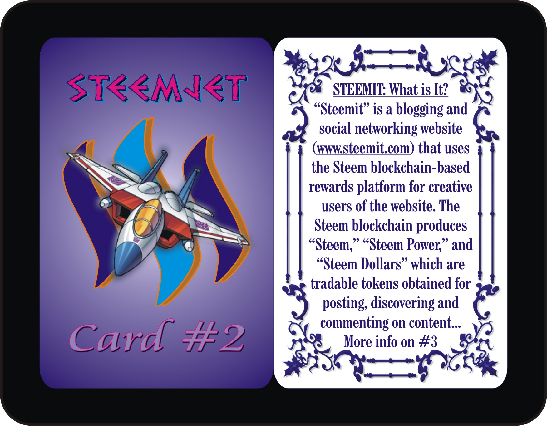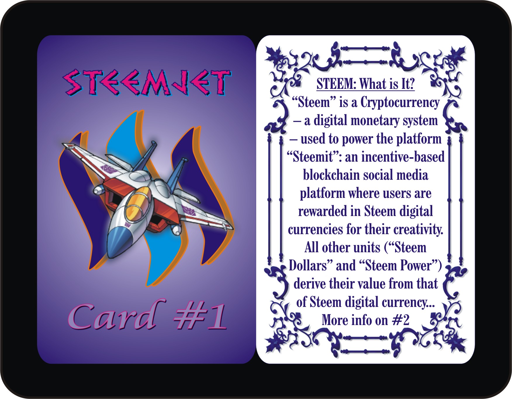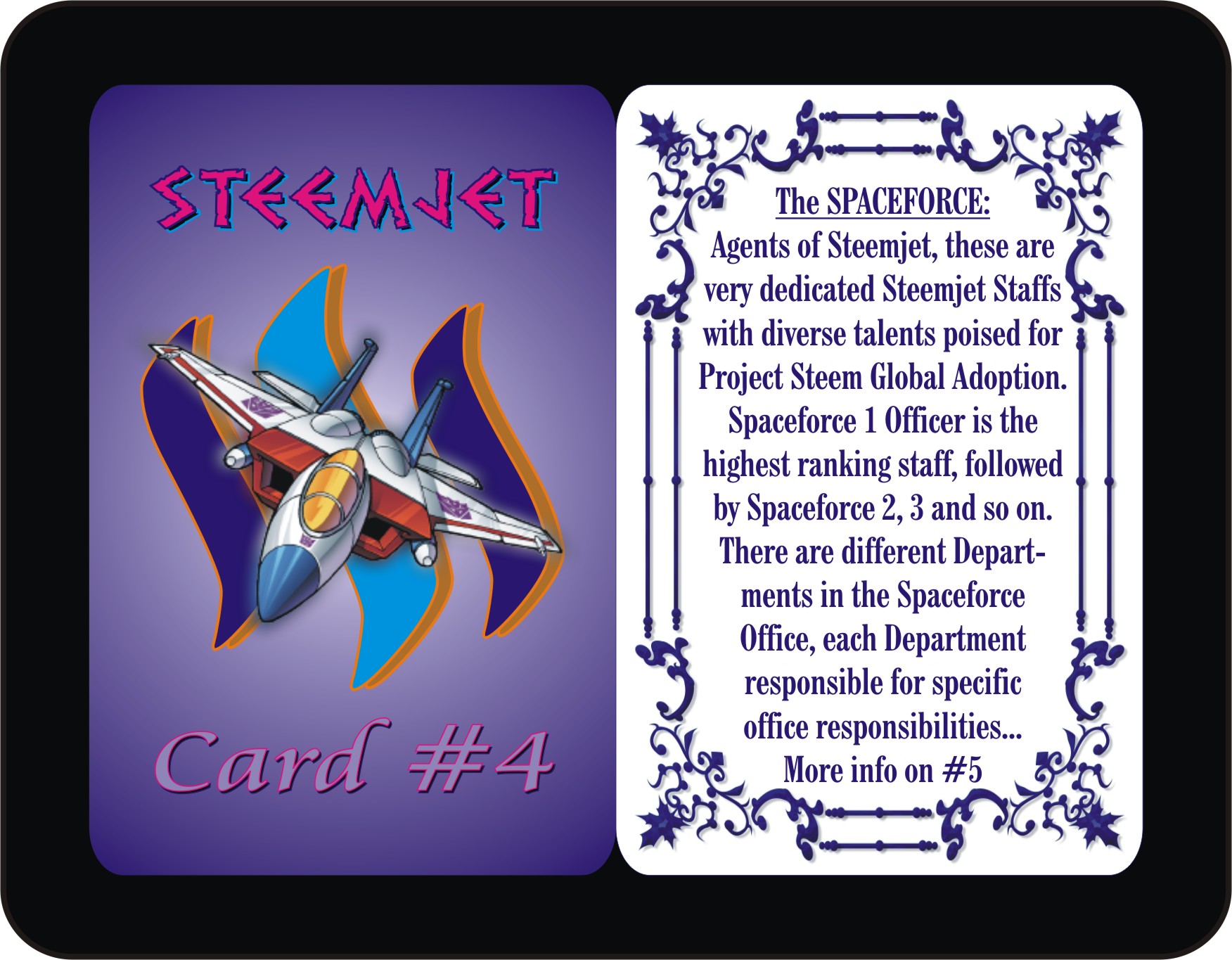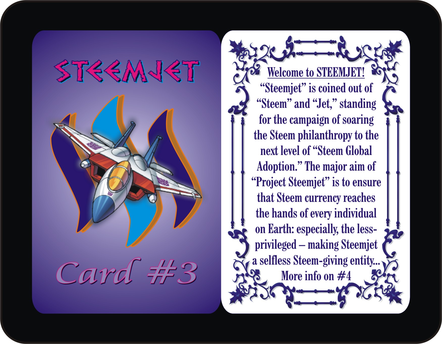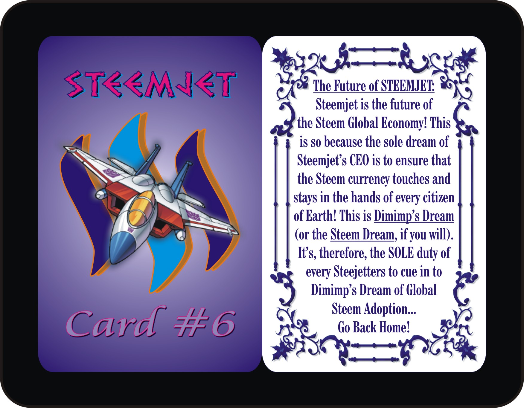 Perusing through the backs of the Steemjet Cards #1 to #6, you will notice some brief emphasis on the message of the Steem currency, Steemit popularity, and Steemjet philosophy which is summarized in three simple words: Steem Global Adoption. These summarized messages are just the introductory aspects of the Steem, Steemit, and Steemjet Global Campaign to make Steem the universal currency of Earth. Hence, the game STEEMJET Basic is more of a base of basic introduction into the world of Steem, Steemit, and Steemjet.