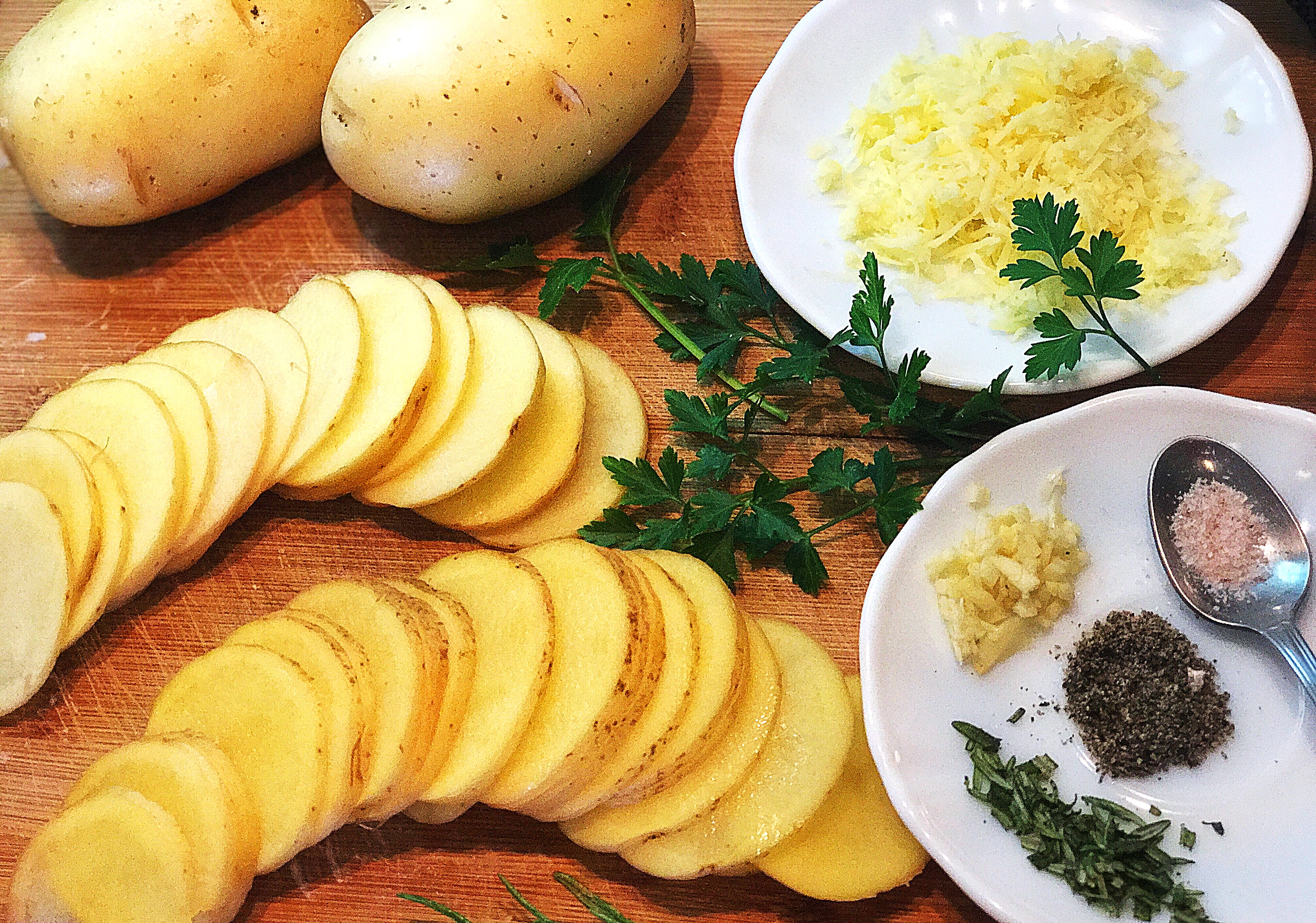 - Use a mandolin slicer on a medium to thin setting to slice the potatoes. (In my case, I don't have a mandolin so I sliced the potatoes manually and it works fine.)