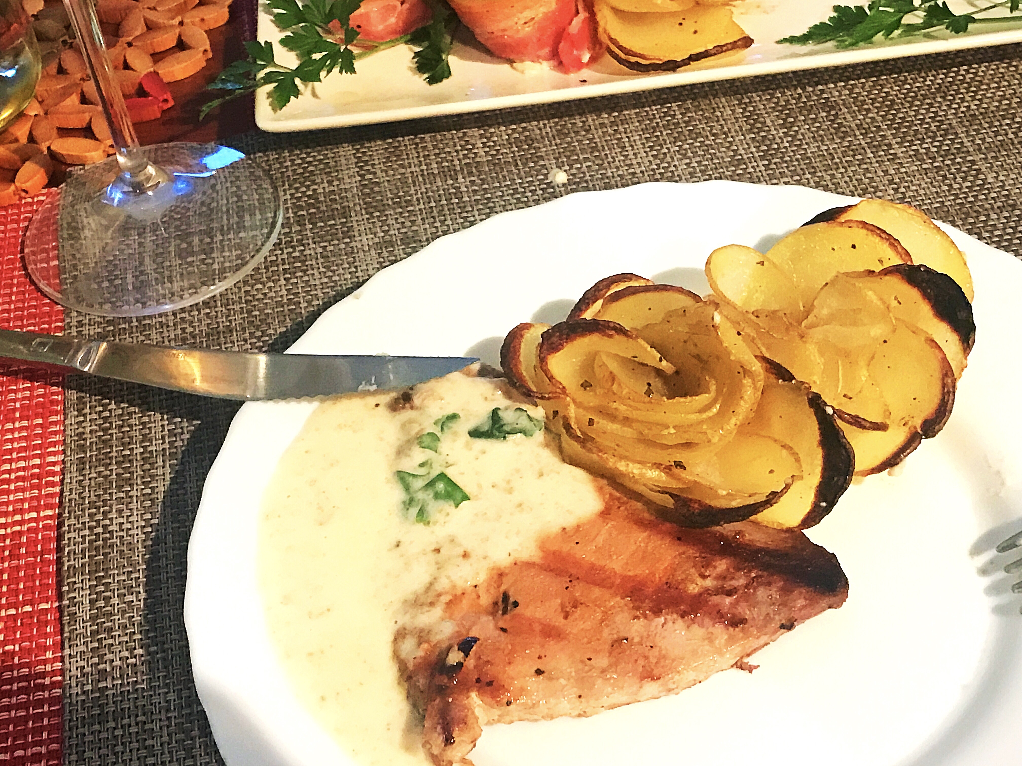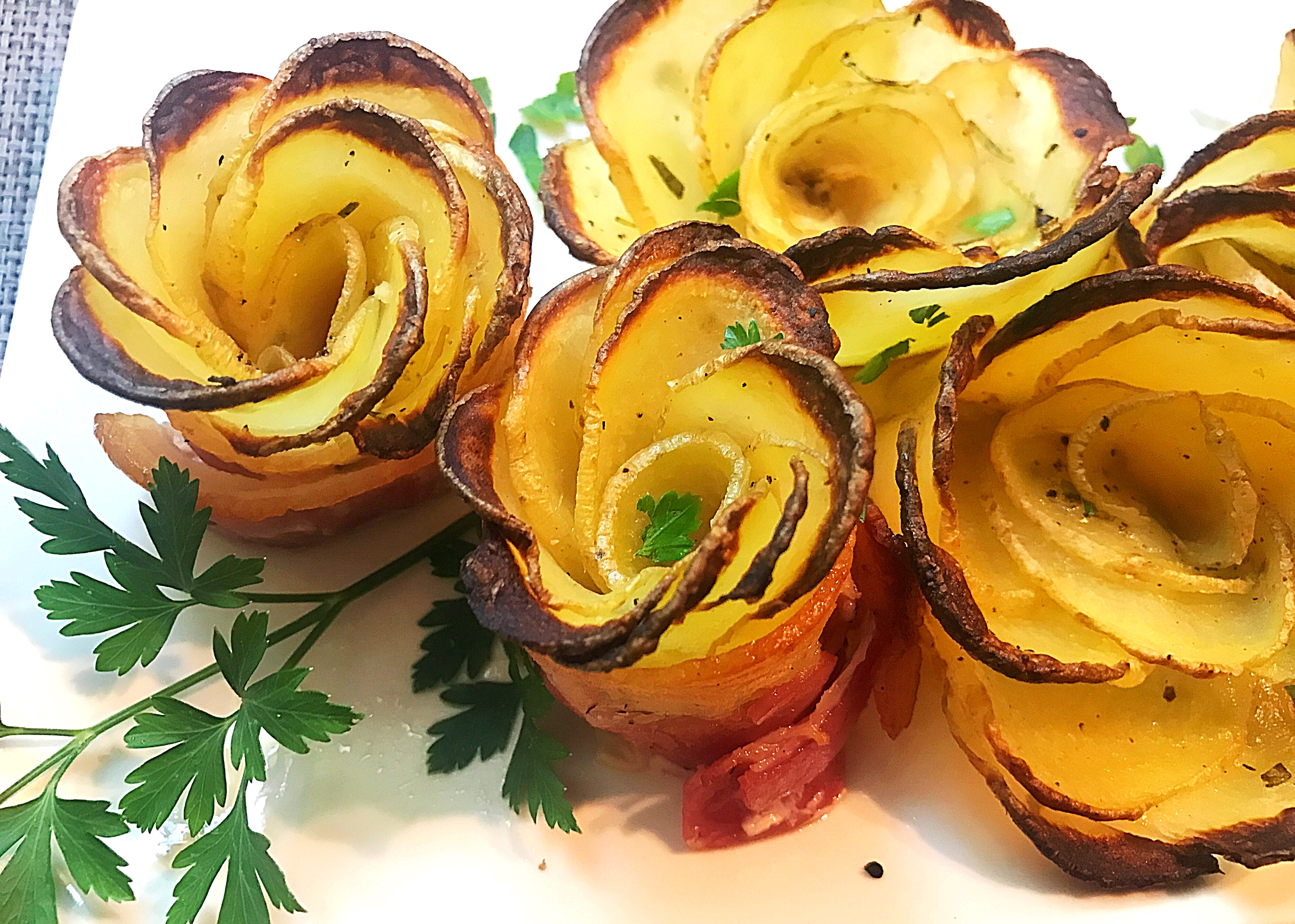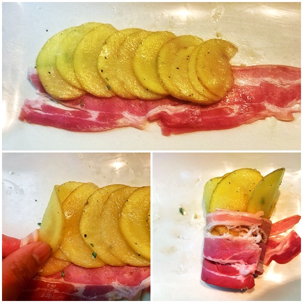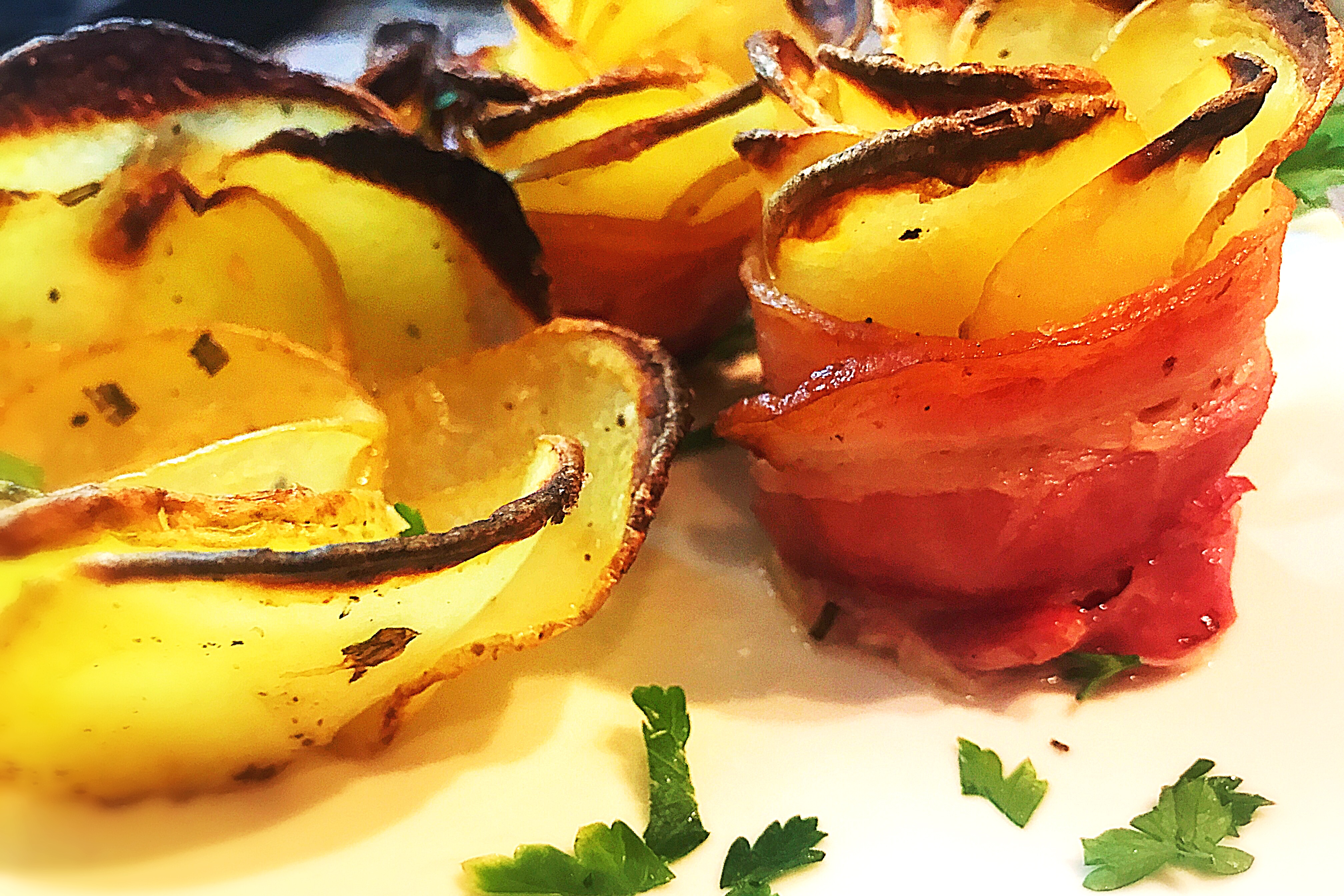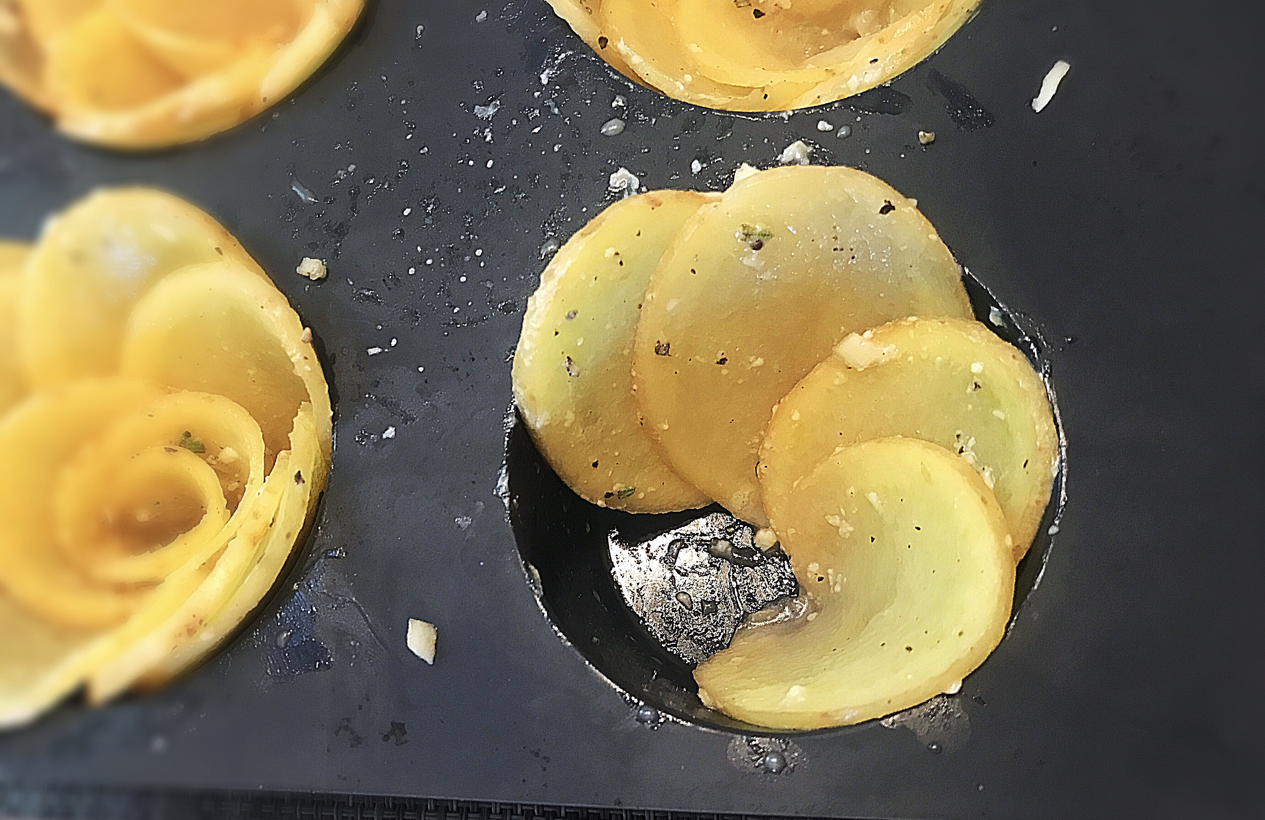 There are different versions to make potato gratins and versions on how to create a rose shape potatoes: You can either arrange it straight inside the muffin pan or wrap with bacon.