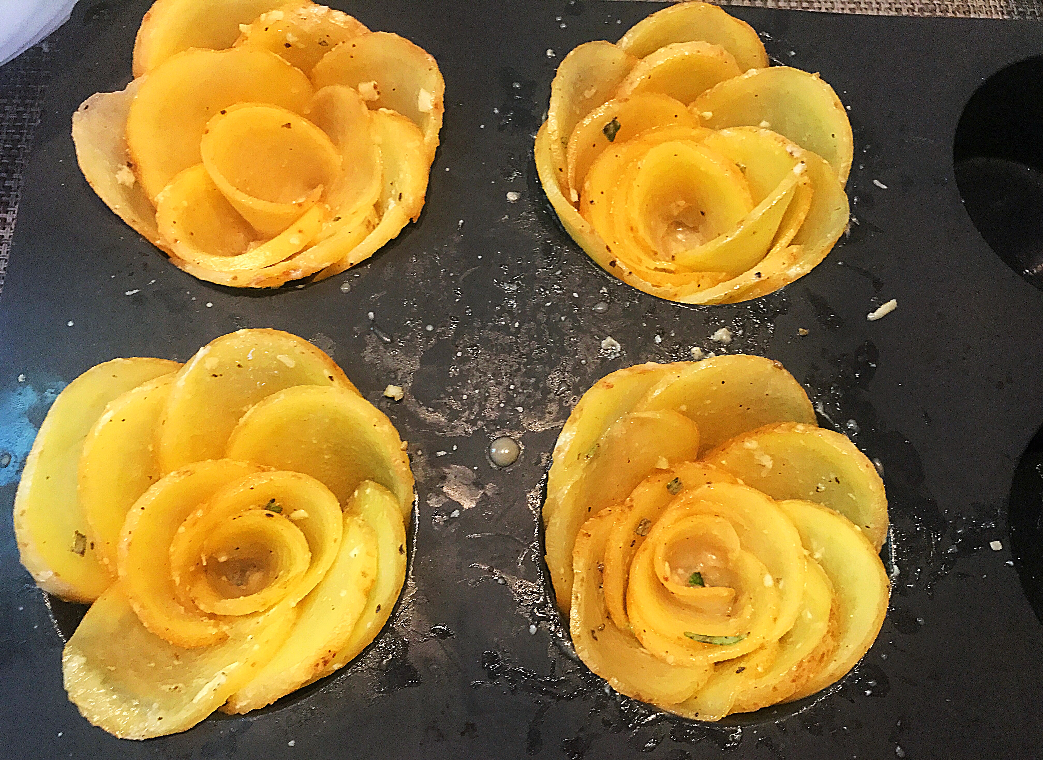 - Carefully lay around 9 to 10 slices of potato in a row and make sure they slightly overlap. Start with the larger size to the smallest one and there you have a full bloomed rose shape potatoes.