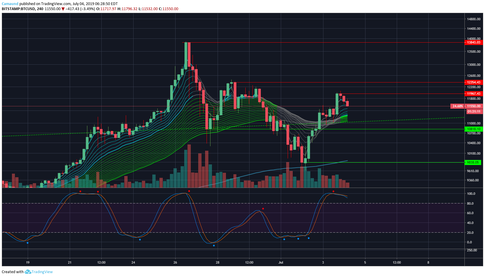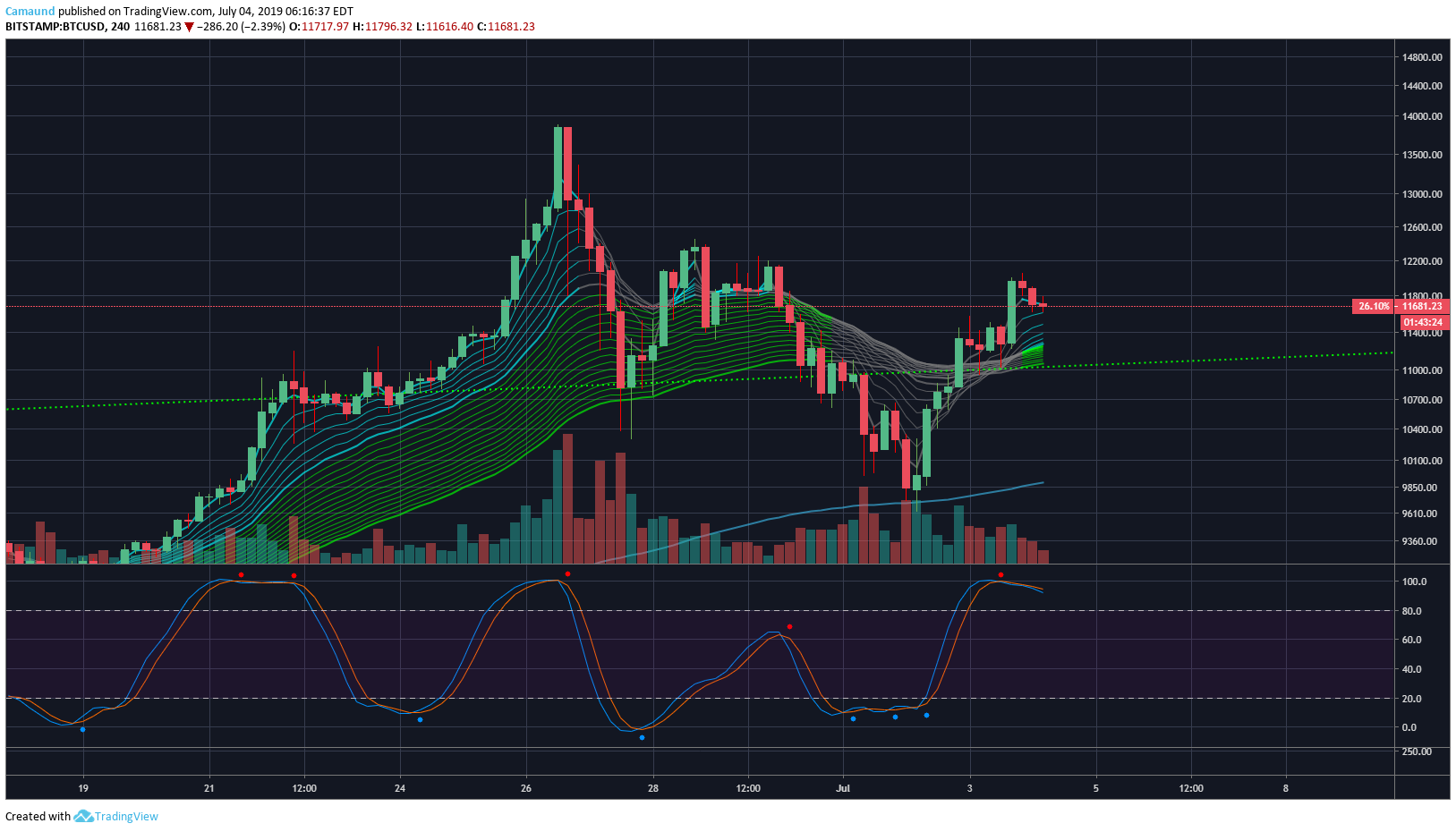 To start, Bitcoin we are up 50% retracement from last ATH. BTC went from $ 19,666 to $3,180. Then up to where we are now at 11,674. We are half way on the retracement.