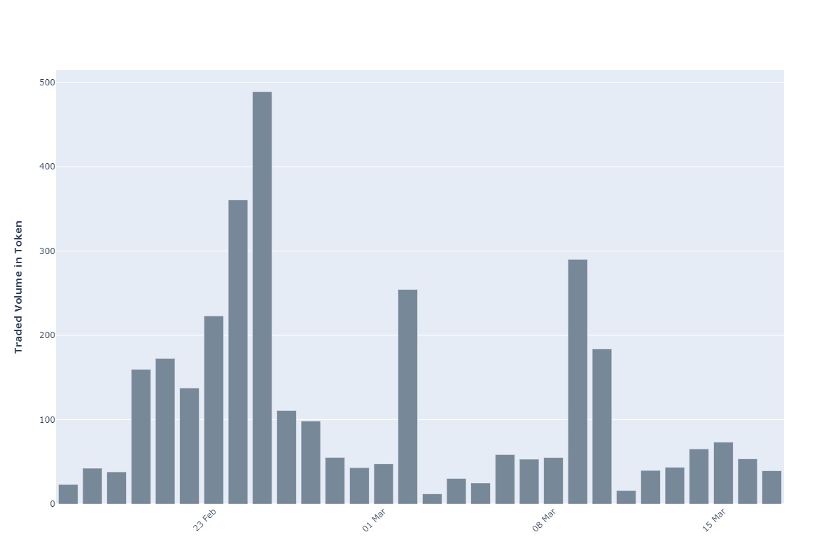 For the chart below, I did issue data from Feb 17th 2020 until Mar 17th 2020 at 12 PM/noon. At this time of yesterday, this token had an opening price of 0.31110107, with a day-high of 0.352 and a day-low of 0.31110107. The closing price was at 0.352.