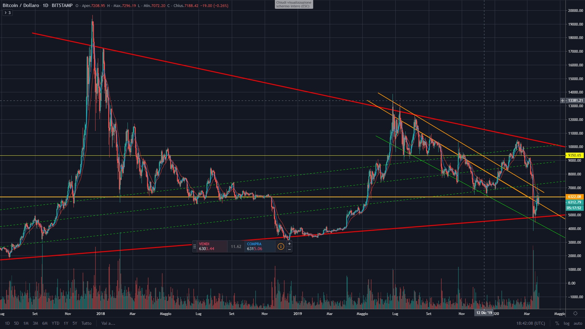 Come di consueto ripropongo il mio grafico che rappresenta le mie ipotesi riguardanti le possibili trend-line di BTC.