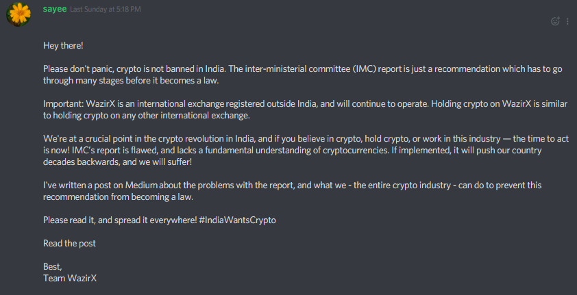 After the leaked draft that has few suggestions on how to treat the holders or distributor of crypto tokens in India, a lot of discussions is going on in Indian discord servers regarding what to do? There are a lot of things that are yet to be get cleared from the official's side. The discussions are regarding how we can safeguard our self from such rules and regulations. This is not a time to say whether it is right or wrong as the government will not going to flip it any soon once it is deployed in general regulations. Inbox is full of emails from various exchange platforms that are currently surviving in India. Thankfully we have a super fine advocate in our discord group that helps us to understand what is happening inside the think tank on this crypto stuff. Thanks to @rzs..!