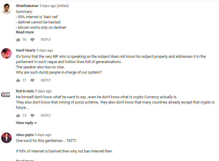 And this is not limited to India only, recently the US government is also taking actions on crypto holders by issuing notice on the tax that applies to them. Below is the video about the discussion on cryptocurrency in Lok Sabha and I attached some beautiful comments by the viewers as well. After watching this video you will get a glimpse on how parliament members are serious on this issue. Either they don't get enough time to describe cryptocurrency or they are not smart enough to put the clear crypto picture.