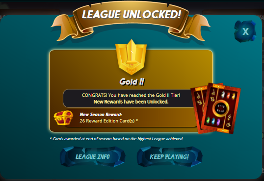 Начал я этот день в лиге Золото 3 с 2056 очками, выпал квест за саммонера Земли – отлично. Закончил день с 2215 очками. Сегодня у меня получилось заработать 159 очков – супер хороший результат. Награда сегодня нормальная – одна эпик карточка, парочка лесных нимф, и четыре бесполезных карточки. Ну до конца сезона я уже дошел до лиги Золото 2, так что следующий рубеж, который буду брать – Золото 1. По крайней мере буду стараться.