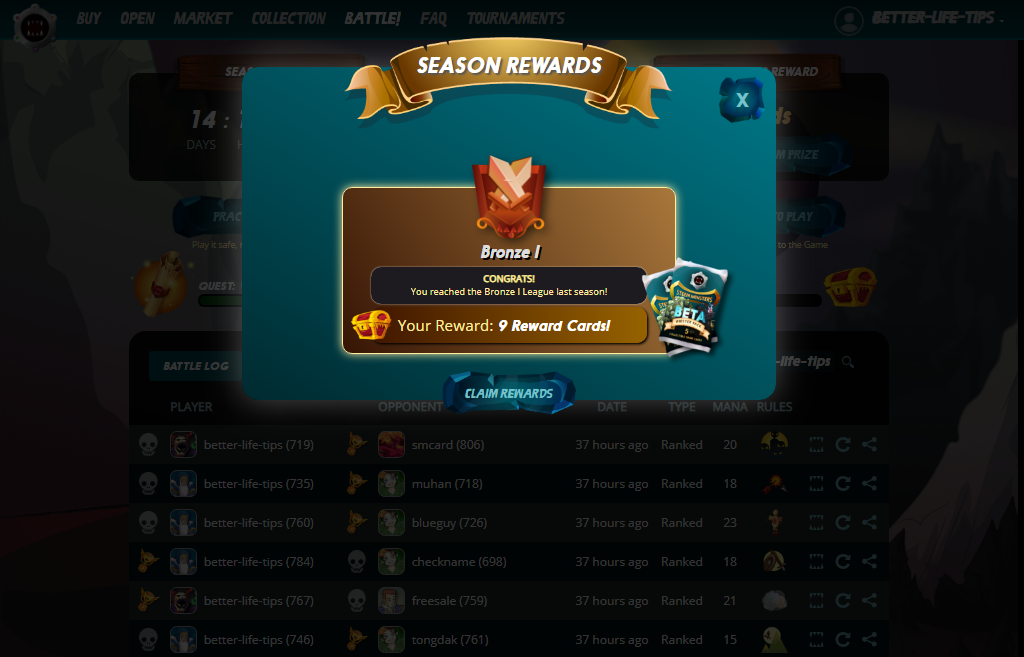 Que tal steemit, ayer fue la final de temporada de steemmonsters y recibi 9 cartas gratis, no alcance a mejorar mi nivel de bronze a silver.
