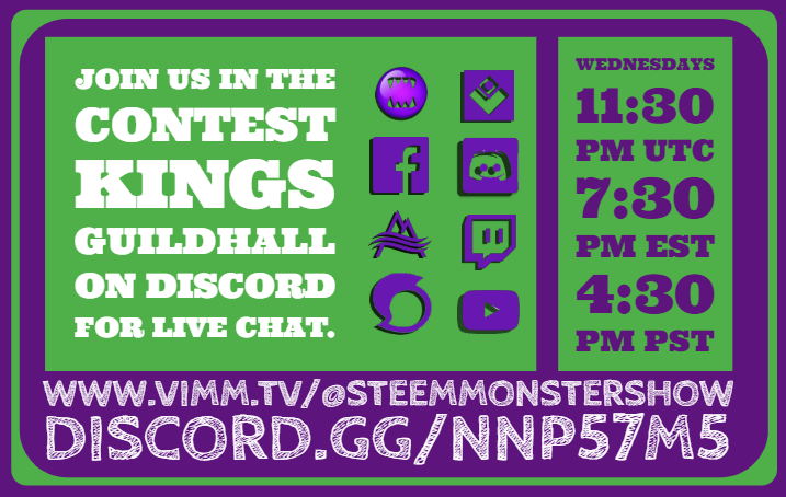 We always meet in the Contest Kings Discord and stream to Vimm, Twitch and YouTube. Check out the @steemmonstershow page for the weekly announcement and details on how to find us.