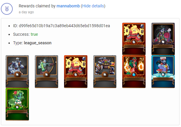 Season rewardsmannabomb (45)in #steemmonsters • 7 years ago I got 9 card rewards this season, so not my best season. It is getting tougher!