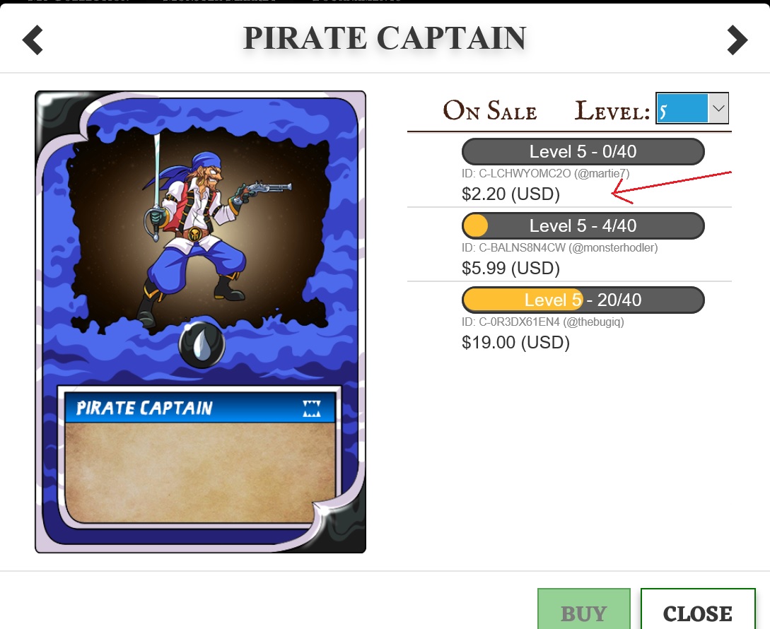 I sell my cheap cardsmartie7 (62)in #steemmonsters • 8 years ago first cards is haunted spider for $0.74 Next card is clay golem. Most low price. And last... Cheaper than others. Pirate Captain. #cards #market #trade #cheap