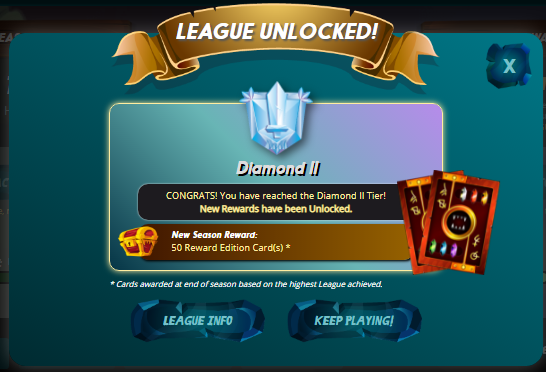 Today, I started with 2809 points in Diamond 3, then I ran a quest for the Water Summoner again, and finished the day with 3101 points in Diamond 2. I manage to earn a lot of points for the second day in a row, and it turns out to move into the next league! And all because the Water Summoner falls to me for the second day in a row. Today it turned out to win 292 points! The reward is still bad - 3 super-cheap Rare cards, not a single useful card either ... Even a nymph, or a sea monster or a gunner did not fall out... Something I have no luck with a reward ... But I earn a lot of points, which is good. Maybe at least in the seasonal award will get a worthy reward)