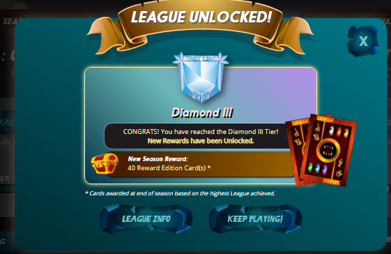 Сегодня мне было предложено пройти квест за призывателя Земли, после того, как я решил сменить призывателя Смерти. Начал день с 2534 очками в лиге Золото 1, потом прошел квест и закончил день с 2810 очками в лиге Бриллиант 3. Награда сегодня попалась далеко не самая лучшая – одна карточка эпик Мантикора, и пара морских монстров, остальные карточки вообще не очень. Выиграл за сегодняшний день 276 очков – супер крутой результат, если вспомнить вчерашнюю потерю 200 очков, то вообще мега-супер крутой… Награда далеко не самая премиальная – из 10 карточек всего 1 эпик и пара карточек, которые можно продать чуть дороже одного-двух центов.