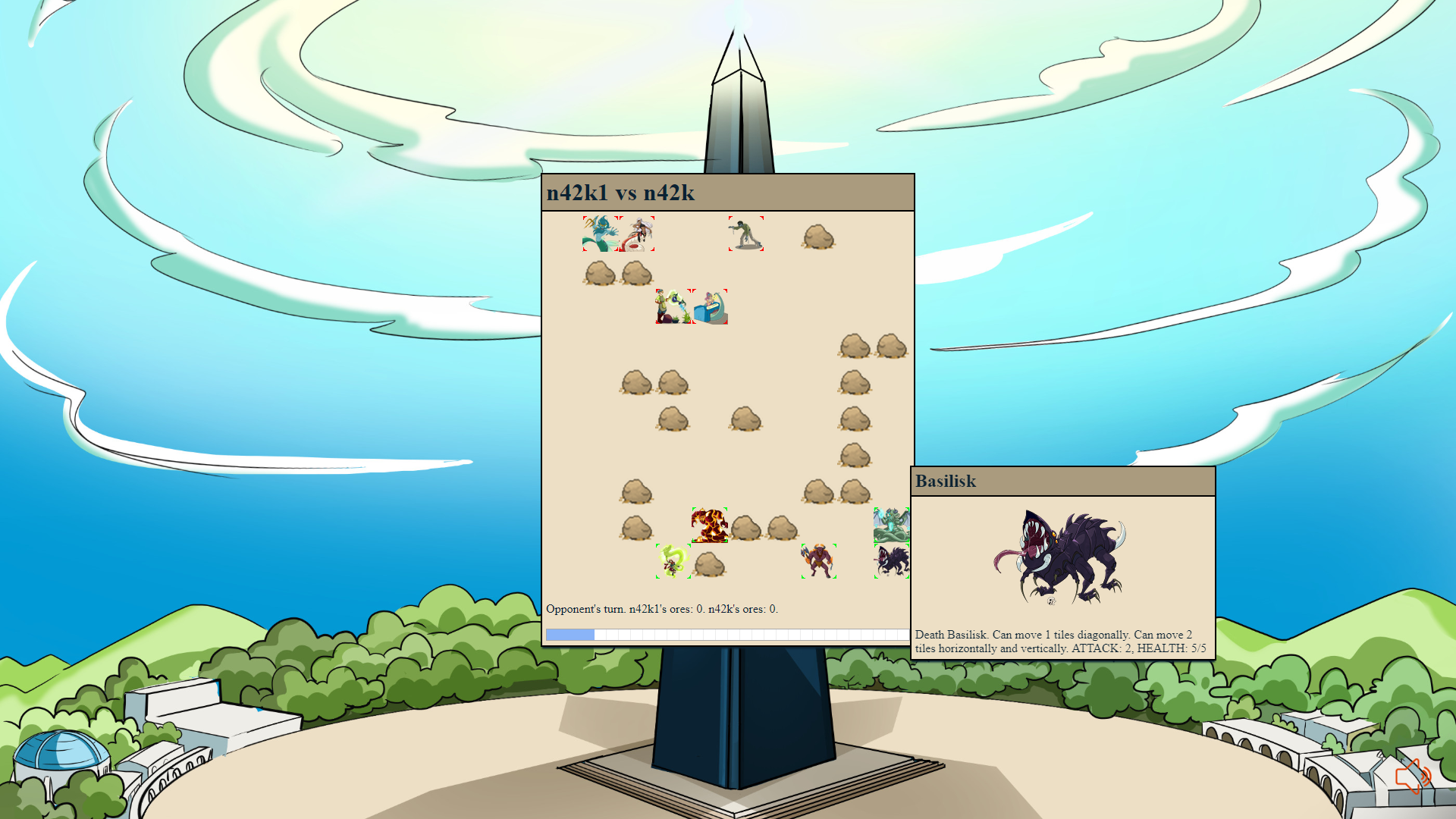 The main game screen. Note the information panel of the Basilisk when you hover the mouse over the monster.