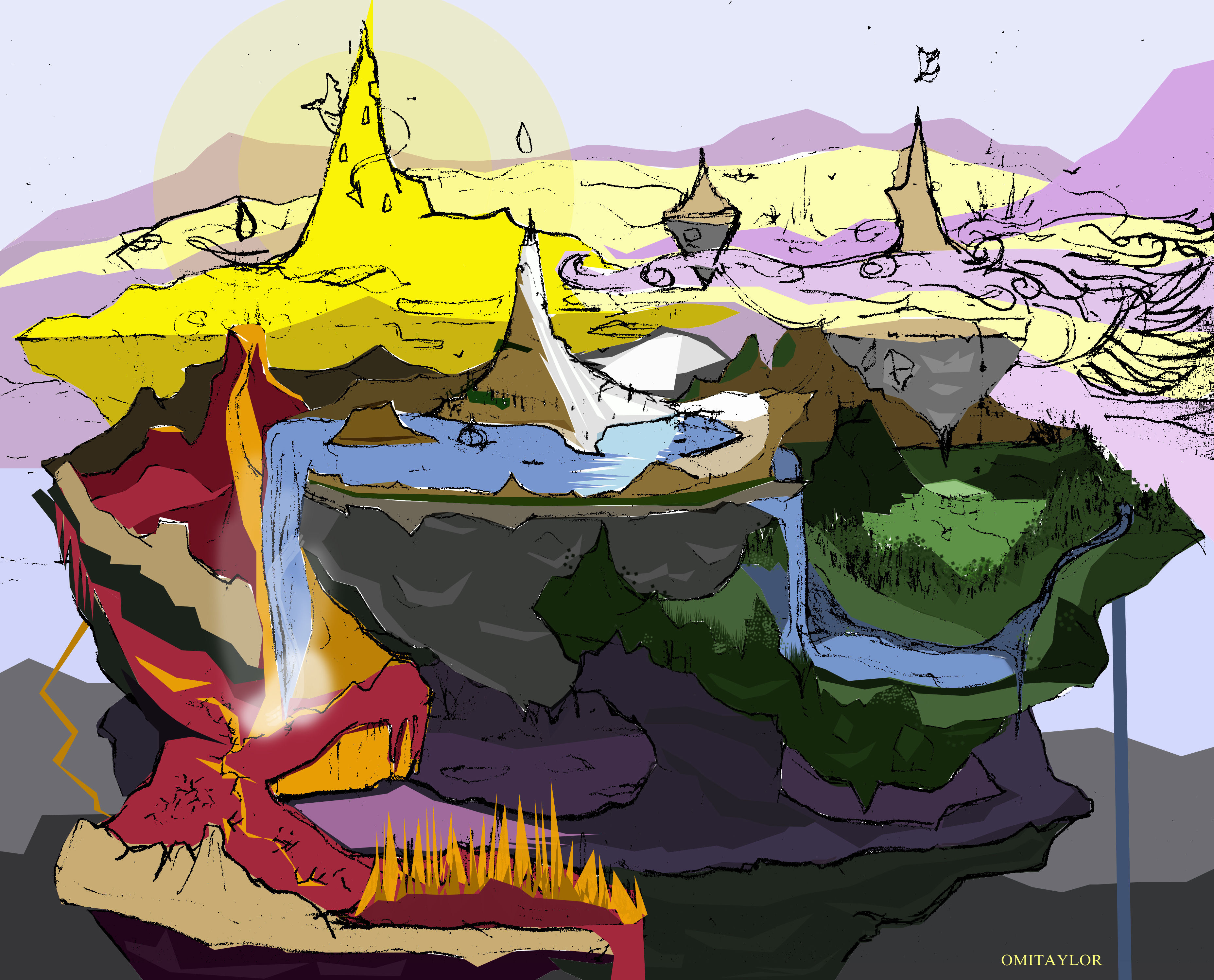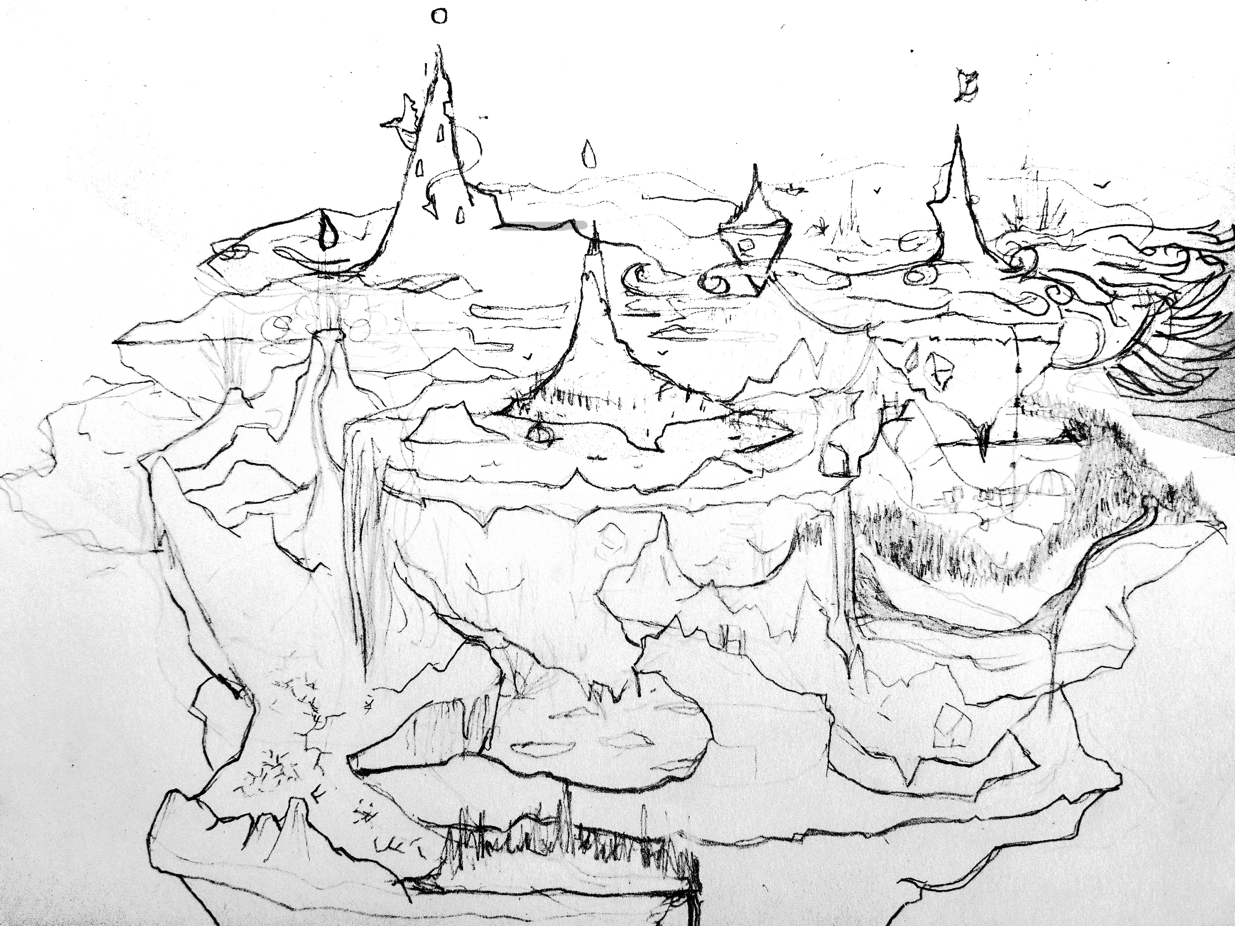 @reseller is who mentioned it would be cool if the map had layers (i.e. the Life was in the clouds, and Death below.) How I visualize it in my mind these "islands" are slanted somewhat, and spin around the center island, which also spins. This also makes sense because then various weather can happen. For example, when water falls on lava it makes Steam, which makes clouds, which makes rain, and fills the water world, which drains into earth and so on.
