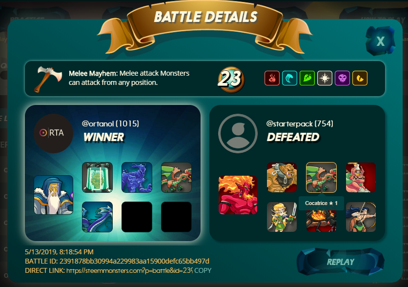 Steem Monsters fight #1 @ortanolortanol (37)in #steemmonsters • 7 years ago Ortanol vs Starterpack Replay > https://steemmonsters.com?p=battle&id=2391878bb30994a229983aa15900defc65bb497d&ref=ortanol Register now > https://steemmonsters.com?ref=ortanol