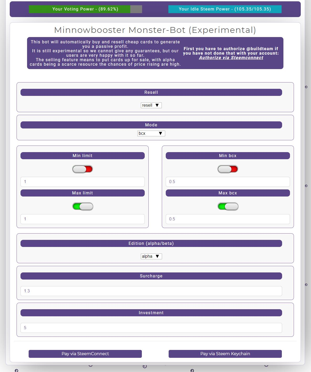 First of all you want to be in resell mode so you can make profits. Resell mode makes it so the bot will buy and than resell the cards. The other mode offered is buy; in which the bot will just purchase undervalued cards. The second setting that is important is the mode the mode that has worked best for me is BCX. BCX buys the cards that are at the lowest price per individual card. most of the time the bot will buy multiples of a card that it can combine and sell for more. The next important setting is the min and max limits. These you can tailor to your preferences so your bot will only spend as much or as little as you like. After choosing your limits you will pick which edition of cards you would like your bot to buy. I am in the camp of buying alpha cards since they are older and the supply is always shrinking. also alpha cards fluctuate in prices more than beta. Surcharge may be the most important setting. the surcharge setting is the setting that decides how much of a premium(added cost to card) the bot will sell the cards for. with a 1.3 surcharge the bot will buy cards that are 30% below market value and resell them for market price. This will net you 25% profit because Steemmonsters takes a 5% selling fee.