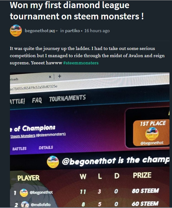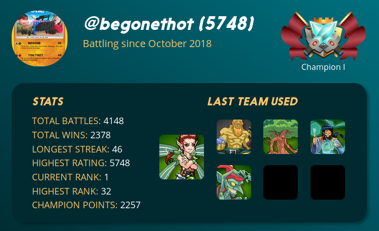 Hello to all the fellow Monsters in the house! What exactly is a Steem Monsters Legend? Well, that would be someone who has been in the #1 spot on the Steem Monsters leaderboard! It is very hard to get there, much less to stay there! In this week's series of Steem Monsters Legends, I would like to introduce to you this week's Legend... @begonethot who is in the Champion league and currently #1 on the leaderboard! He has claimed that spot for 6 days now and counting! What a fast come up I noticed with him! He is an outstanding Steem Monsters player with a total of 3,800 battles and 2,152 wins! This information is current as of today, which is March 25,2019. He has a longest streak record of 46 and a highest rating of 5,362!