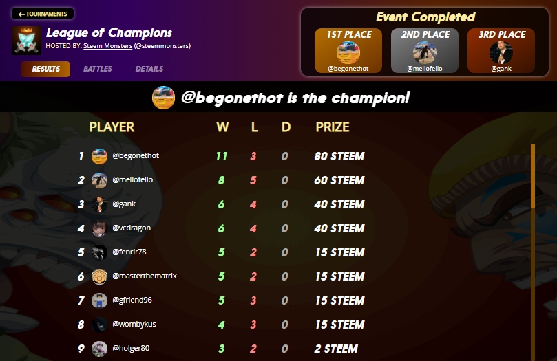 1.) First of all congratulations on being #1 on the Steem Monsters leaderboard as well as winning first place on a recent Steem Monsters League Of Champions tournament! Can you tell us all a little bit about yourself and your background in gaming. Did you play Magic or Hearthstone?