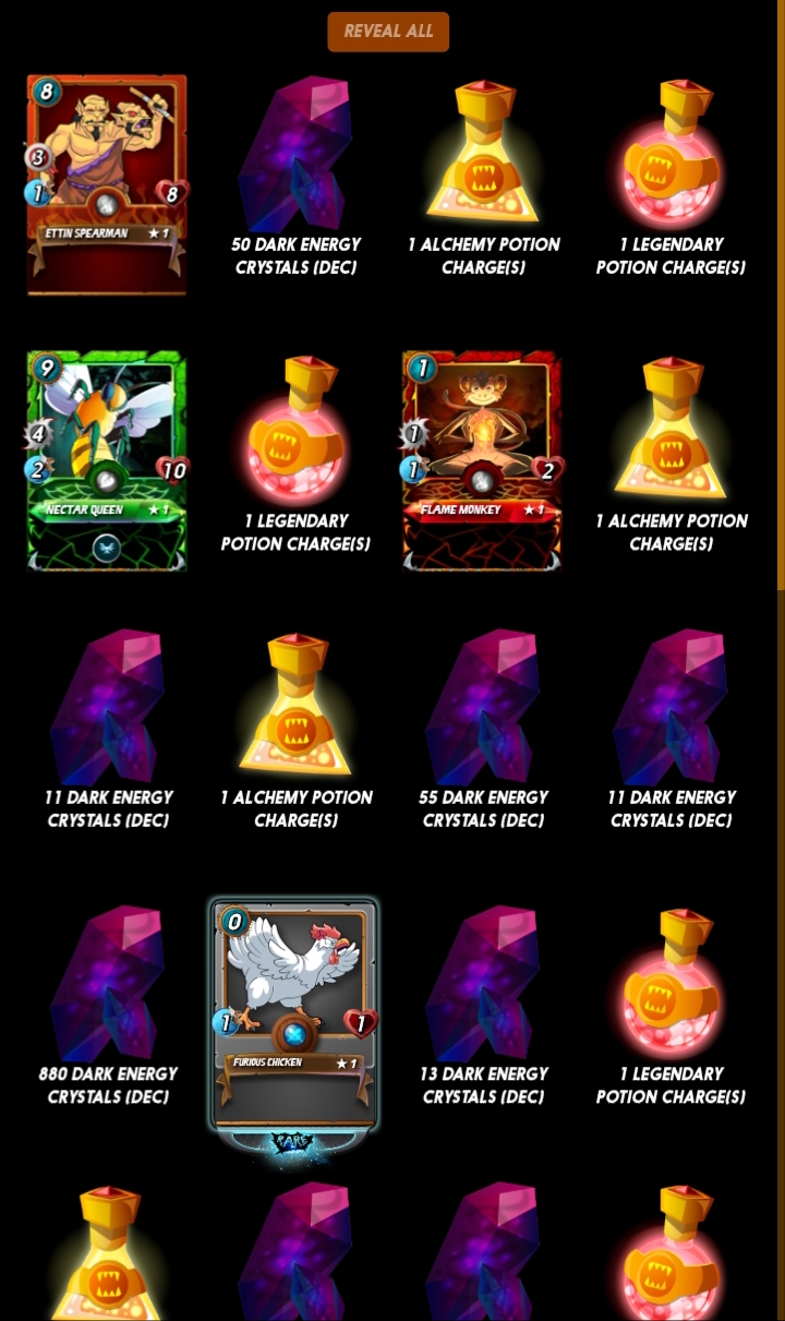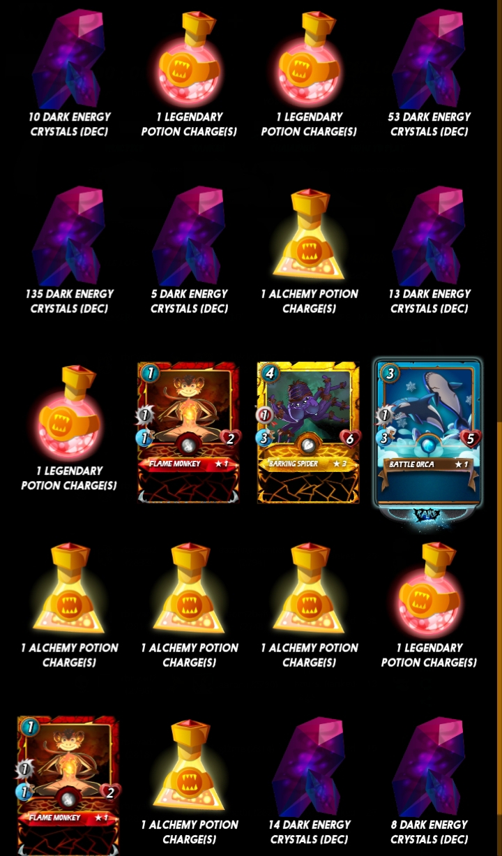 I received 40 loot chests this season.1358 dec in loot chests I got it.I received the 8th Legendary potion and the 9th Alchemy potion. I got 3Flame monkey card ,1Barking spider card,1Battle orca card,1 Nectar queen,1 Ettin spearman,1furjous chicken.I've shared my screenshot