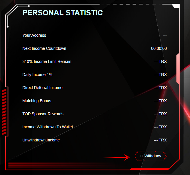- Once your Tronchain account comes up, scroll down to the "PERSONAL STATISTICS" section. In this section, you will see all details concerning your personal investment. Go down to the bottom where you will see "Unwithdrawn Income" - Now that is the amount of your daily 1% earnings that is available for you to withdraw into your wallet.