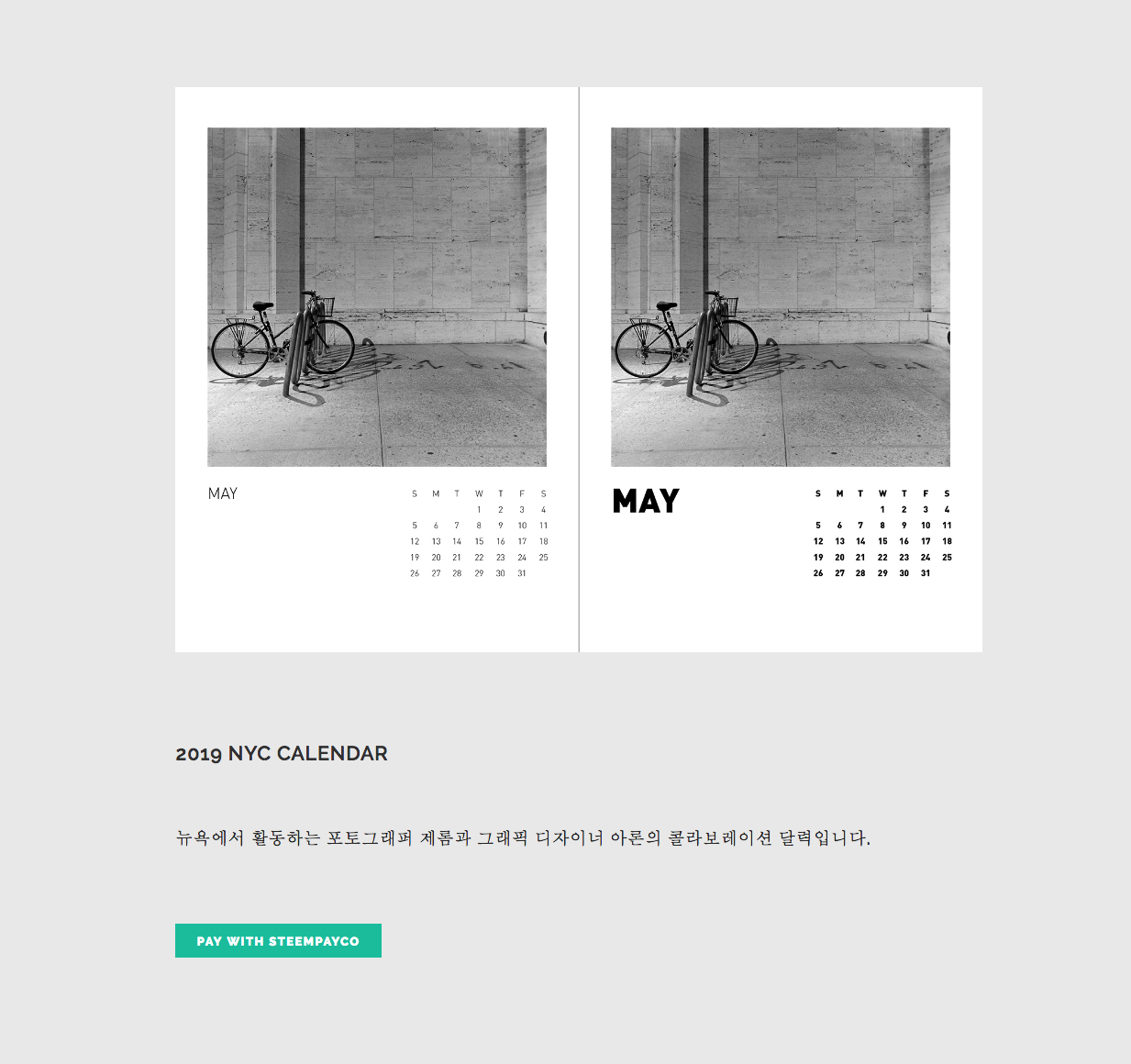안녕하세요. 이번 샌드박스(@sndbox) 프로젝트로 스티미언인 포토그래퍼 제롬(@jeromecha)과 콜라보 작업으로 2019 뉴욕 달력을 제작했습니다. JEROME은 뉴욕을 베이스로 활동하는 포토그래퍼로 패션, 잡지 등 여러 분야에서 활동하고 있고 개인작업도 꾸준히 이어가고 있습니다. 중형 필름카메라를 이용해 제롬만의 독특한 감성으로 담아낸 뉴욕의 사진들을 가지고 전부터 달력을 만들고 싶은 욕심이 있었는데 이번에 드디어 제작하게 됐습니다. 흑백필름으로 담아낸 뉴욕의 모습에서 아날로그 감성을 느끼실 수 있을 것입니다. 이번 제작된 달력은 스팀페이코(@steempayco)를 통해 판매해볼까 합니다.