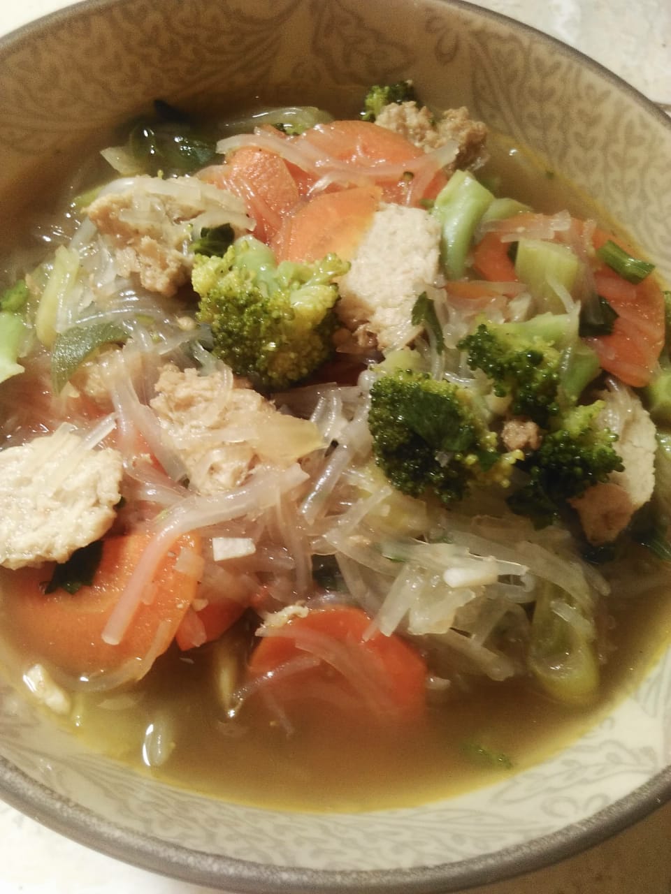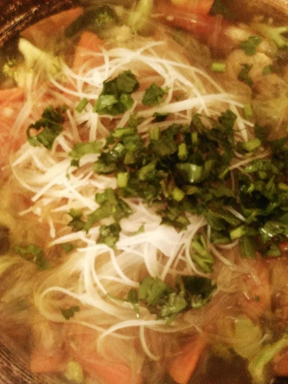 Terakhir masukkan soun dan seledri. Lalu aduk sampai air agak kental. Matikan api. Udah deh.