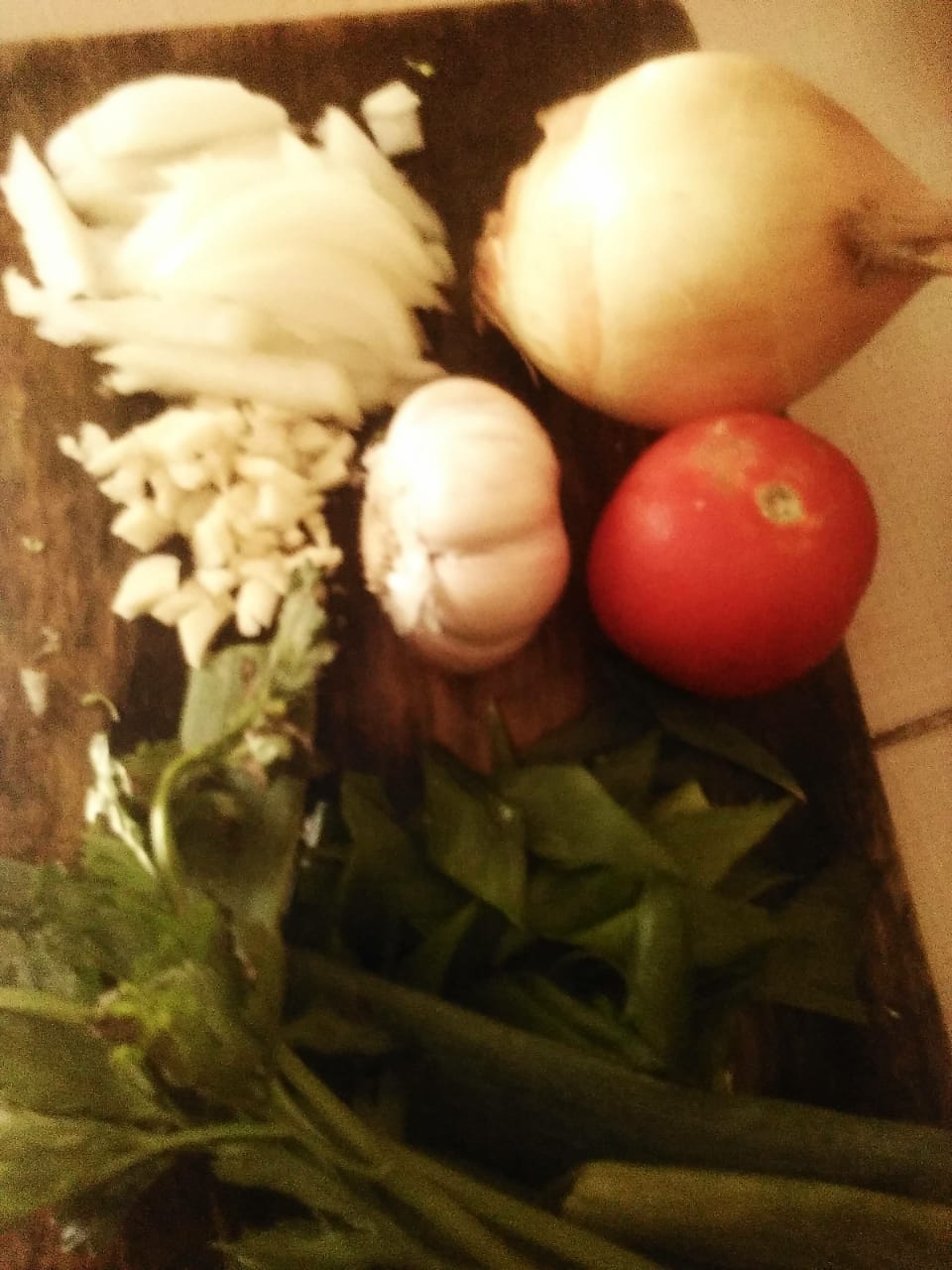 1 medium-sized onion cloves, 1 clove of garlic, 1 small tomato, 1 stick of spring onions and 1 celery stick, 1 tsp of ground pepper, 1 teaspoon of salt, 1/2 tsp sugar, 1 tsp mushroom broth, and 1 tsp soy sauce.